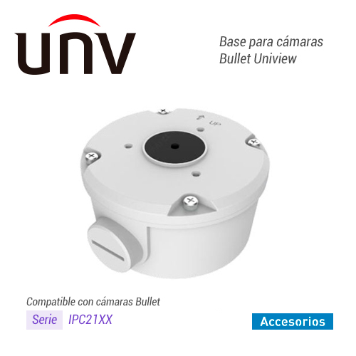 Descripción Descripción TR-JB05-B-IN Base para camaras Bullet UNV Compatibles con IPC21XX Bracket TR-JB05-B-IN Aplicación Junction box para IPC21XX con base circular Dimensiones 104.4mm*54.5mm(4.11" x2.15") Peso 0.36kg(0.79lb) Material Aleación de aluminioDocumentosFicha técnica