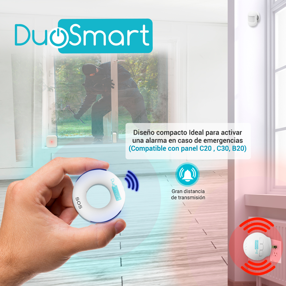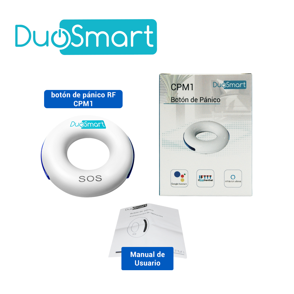 Botón de pánico RF Duosmart - CPM1 (Baterias no incluidas) Compatible con paneles C10 C20 y C30 Botón de pánico en forma de anillo, adoptando un resonador acústico para garantizar una frecuencia estable, una fuerte señal de penetración y un bajo consumo de energía. Presione el botón de pánico cuando se tenga una emergencia, el botón enviará una señal al panel de alarma para hacer una alarma de emergencia. Características Consumo de corriente: 20 mA Bateria : LR44 (3 piezas) no incluidas Frecuencia de transmisión: 433 MHz Alimentación 4.5 VCD