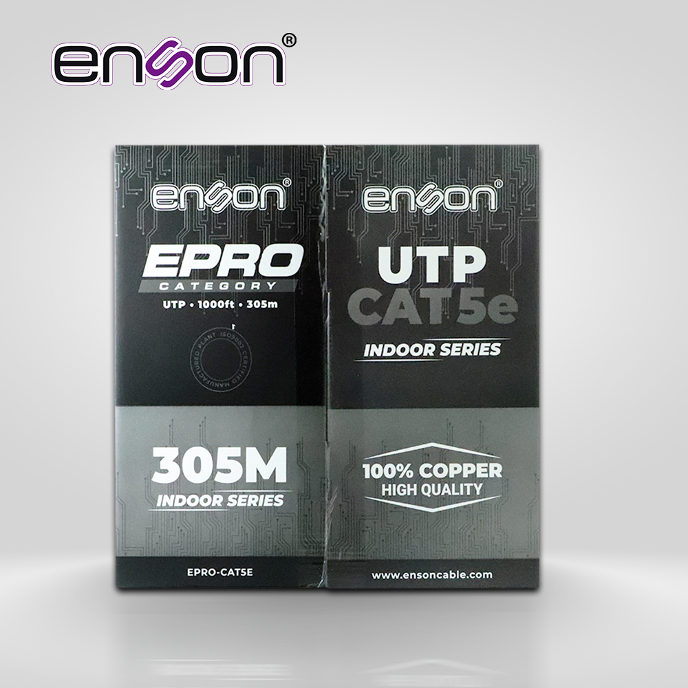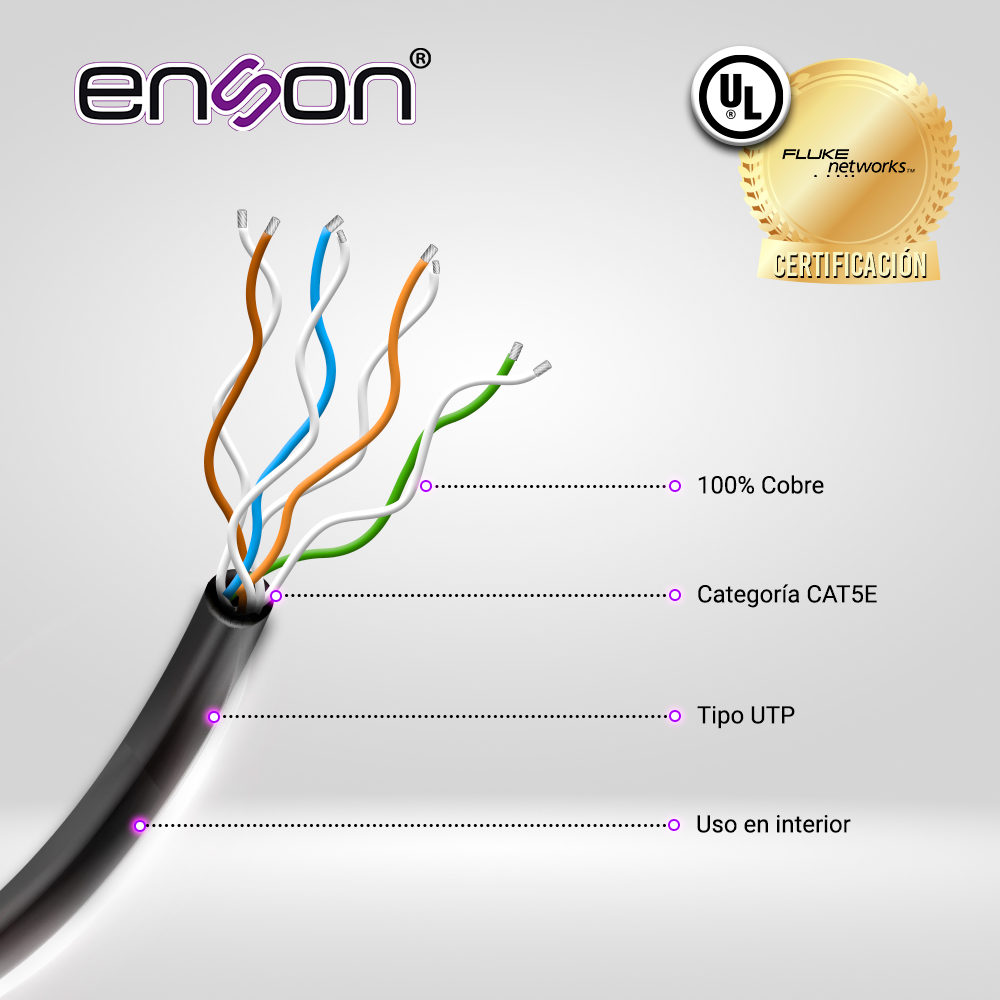 EPRO-CAT5E ENSON Un cable de categoría 5e (Cat 5e) es un tipo de cable de red que se utiliza comúnmente para la transmisión de datos en redes Ethernet. Aquí están las características clave de un cable Cat 5e: Velocidad y ancho de banda: Un cable Cat 5e es capaz de soportar velocidades de hasta 1000 Mbps (1 Gbps) y un ancho de banda de hasta 100 MHz. Esto lo hace adecuado para redes Ethernet 10/100/1000BASE-T. Par trenzado: Al igual que otros cables de red de categoría, un Cat 5e consiste en pares de cables de cobre trenzados. Por lo general, contiene cuatro pares de cables trenzados. Longitud máxima: La longitud máxima recomendada para un cable Cat 5e es de 100 metros (328 pies) para mantener un rendimiento óptimo. Si se requiere una longitud mayor, es posible que se necesiten dispositivos como repetidores o extensores de señal. La certificación UL, que proviene de Underwriters Laboratories, es una de las organizaciones de pruebas y certificación más reconocidas a nivel mundial. Fundada en los Estados Unidos, UL se especializa en la evaluación de productos y la emisión de certificados de seguridad para una amplia gama de productos, sistemas y componentes..