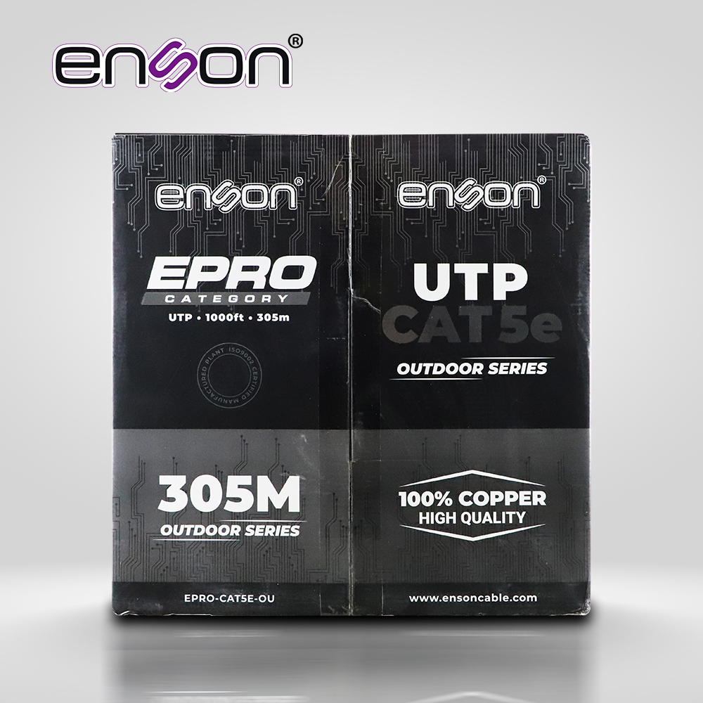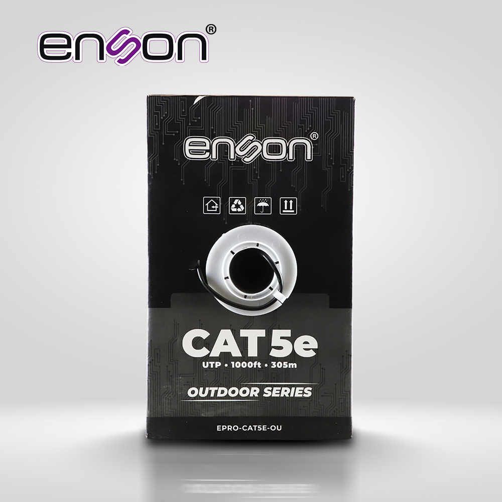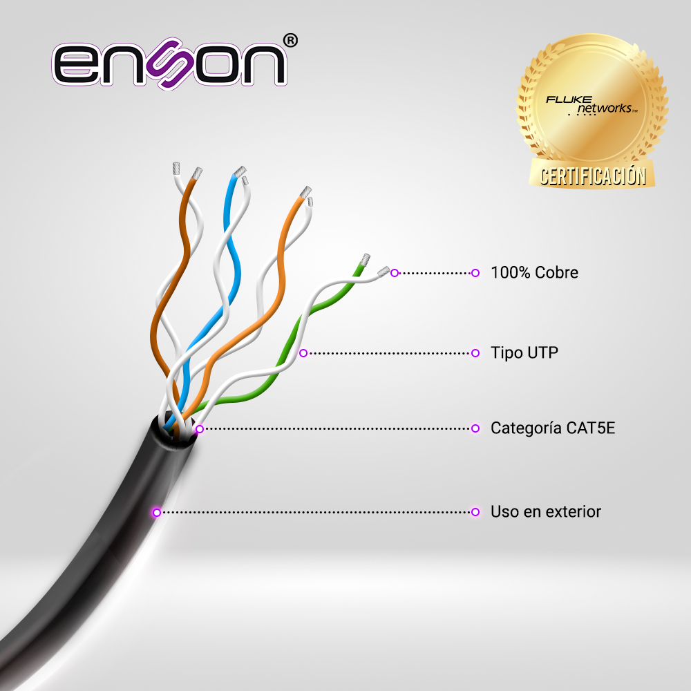 EPRO-CAT5E-OU ENSON Cable UTP categoria 5E uso exterior Conductor de cobre calibre 24 AWG 100% Cobre Uso exterior Longitud 1000 pies / 305 metros Cable horizontal para instalaciones, FastEthernet. Conductor tipo solido. Color Negro Cumple con ISO 9002 Serie EPRO