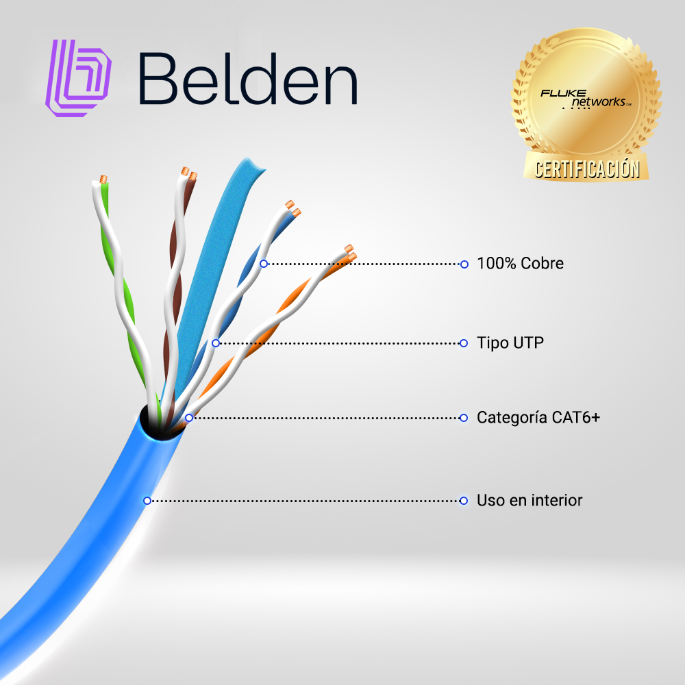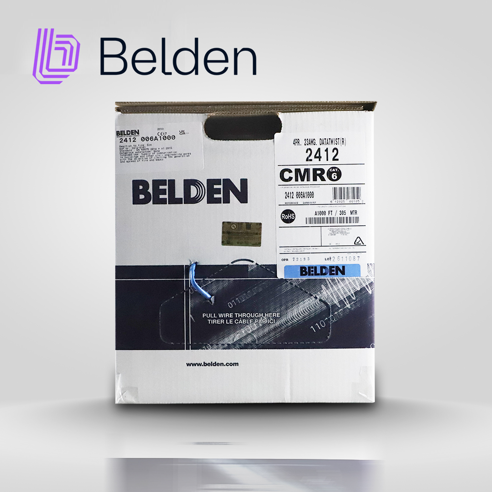 2412 006A1000 BELDEN CAT6 (350MHz), 4 pares, U / UTP sin blindaje, Riser-CMR, Cable horizontal Premise, Conductores de cobre sólido de 23 AWG, separador de cinta, cubierta de PVC Bobina de 1000 ft o 305 metros. Conductor de cobre calibre 23 AWG. Para uso en Interior Cable horizontal para instalaciones, Gigabit Ethernet Color Azul 100% Cobre Conductor tipo solido