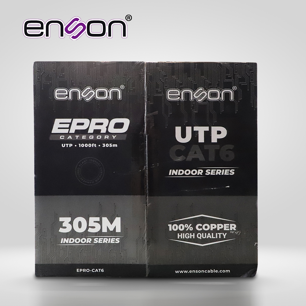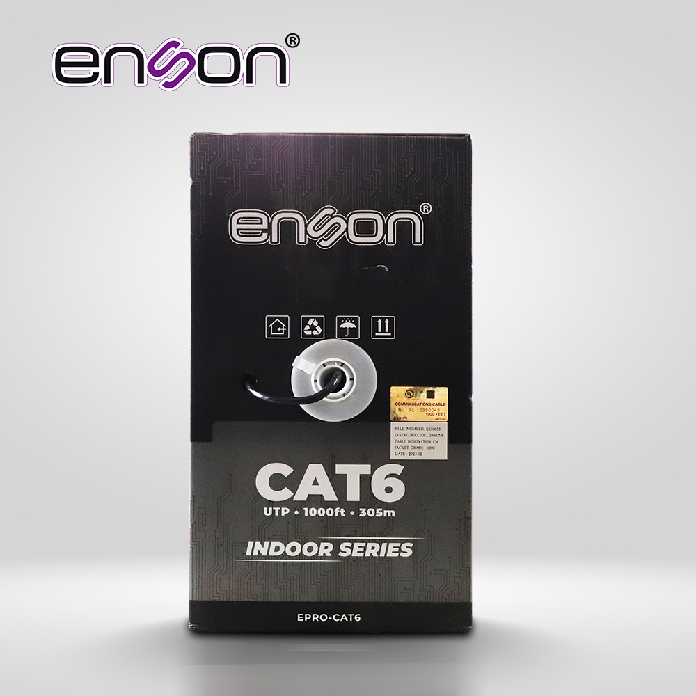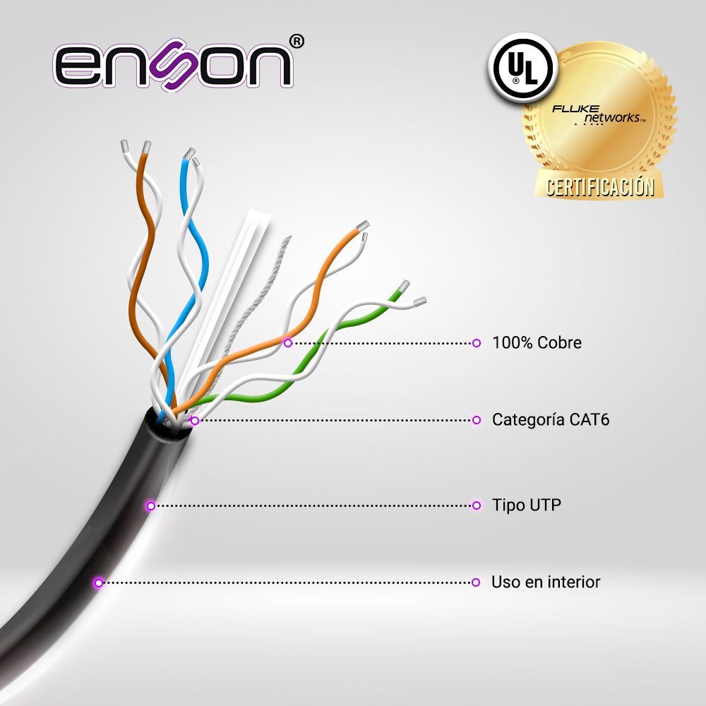 EPRO-CAT6 ENSON Cable UTP categoria 6 4 pares 23 AWG 100% Cobre Uso interior Certificacion UL El cable UTP (Unshielded Twisted Pair) de categoría 6, comúnmente conocido como Cat 6, es un tipo de cable de red utilizado para transmitir datos en redes Ethernet y otras aplicaciones de comunicación.