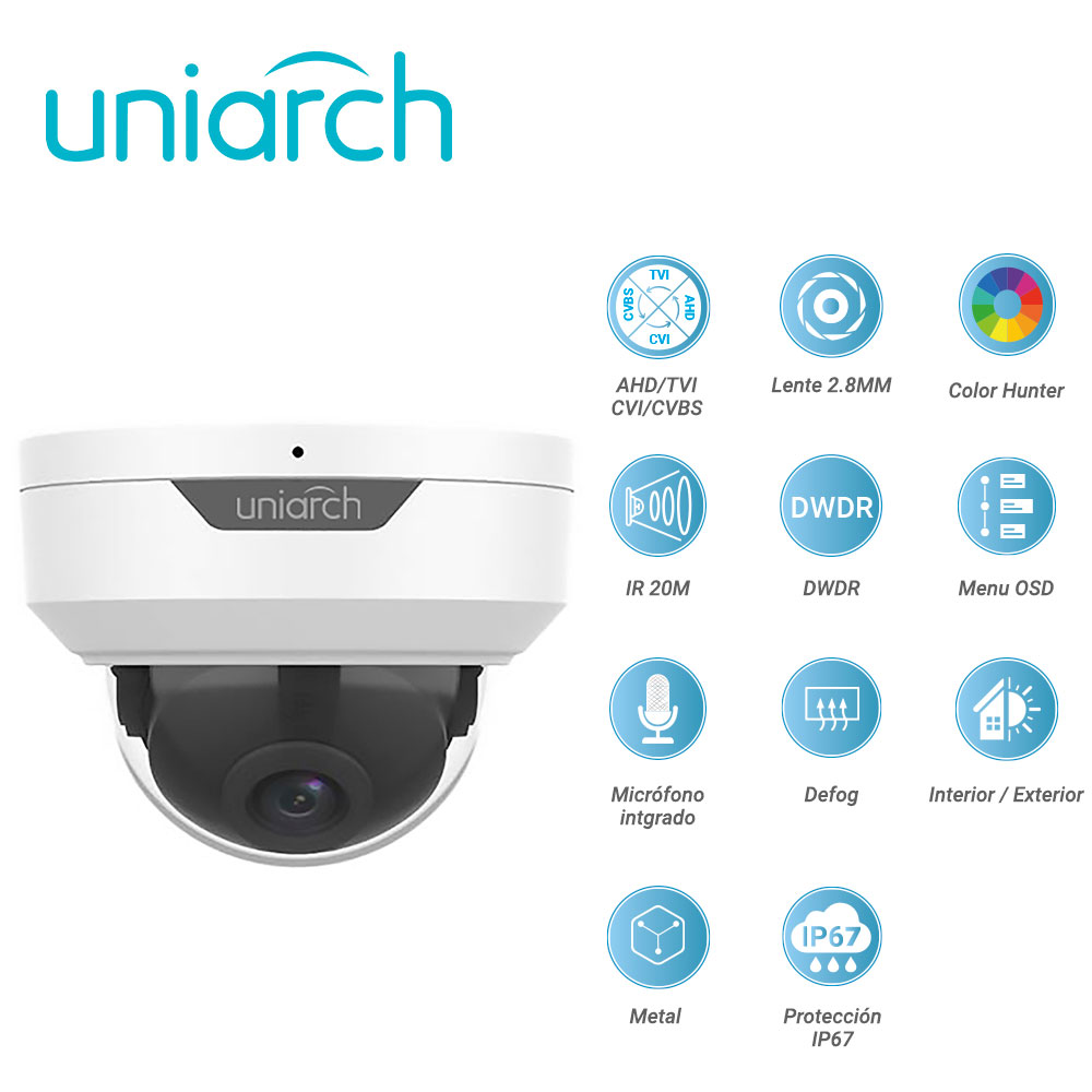 CAMARA ANALOGICA LIGHTHUNTER DOMO INTERIOR / EXTERIOR AHD/TVI/CVI/CVBS UNIARCH UAC-D122-AF28M / 2MP La UAC-D122-AF28M es una cámara analógica de domo fijo LightHunter HD IR de 2 MP con un sensor de 1/2,9 pulgadas de alto rendimiento. Sensor CMOS y tecnología de reducción de ruido 3D. Admite TVI/AHD/CVI/CVBS, lo que mejora de manera efectiva el producto adaptabilidad y diversidad de soluciones de red. La cámara puede lograr transmisión de video HD de megapíxeles de bajo costo, larga distancia y antiinterferencias sin demora de tiempo. Proporciona imágenes en color durante el día e imágenes en blanco y negro durante la noche. la cámara también admite entrada de audio y transmisión síncrona de audio y video.