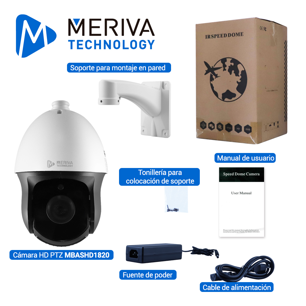 CÁMARA HD PTZ MERIVA TECHNOLOGY MBASHD1820 / AHD / TVI / CVI / CVBS / 2 MP La cámara PTZ MBASHD1820 es una cámara PTZ de alta definición de 2 MP, que cuenta con tecnología AHD (Analog High Definition) que permite que la imagen se transmita sin comprimir ni codificar con la más alta calidad HD y sin retardos. Ideal para exteriores, con LEDs IR que permite visualización en ausencia de luz con un alcance de hasta 100 metros. Caracteristicas: Resolución: 2 MP (1920x1080)@ 30/25 fps. Lente motorizado: 5.1 - 92 mm. Zoom de X18. Rango de rotación: Pan; 0 ~ 360°, Tilt; 0 ~ 93°. Hasta 220 presets. Hasta 3 cruceros (máximo 16 preset). Modo de comunicación: RS485 / Coaxial (CoC). Alimentación: 12 VCD 3 A. Distancia IR, de hasta 100 m. Protección contra descargas por rayos de hasta 6000 V.