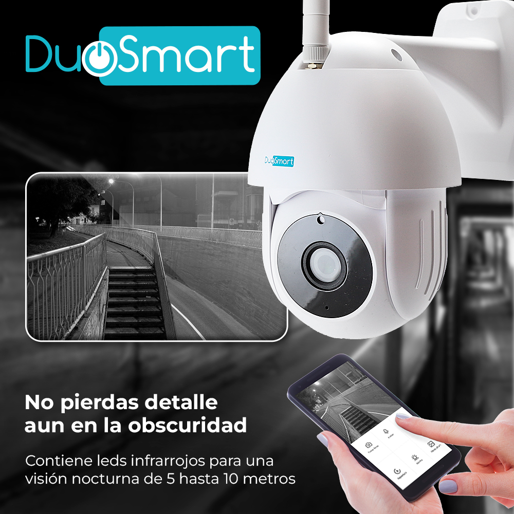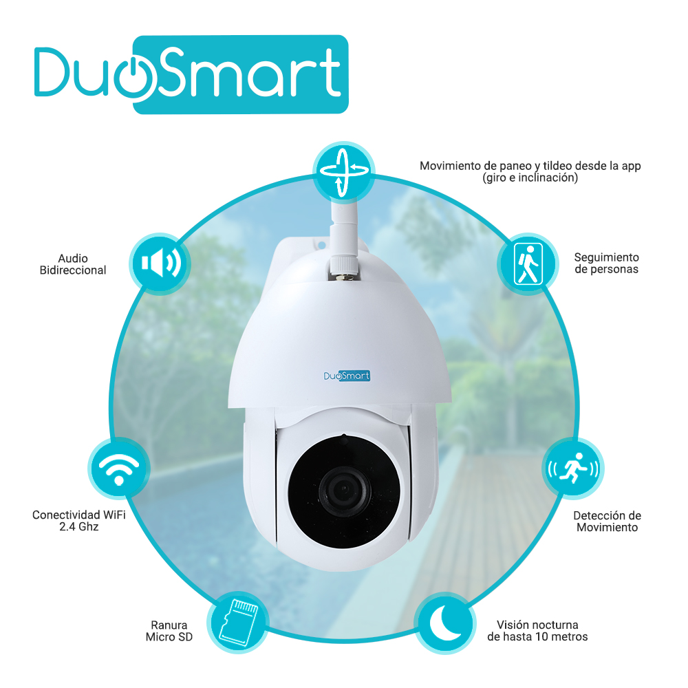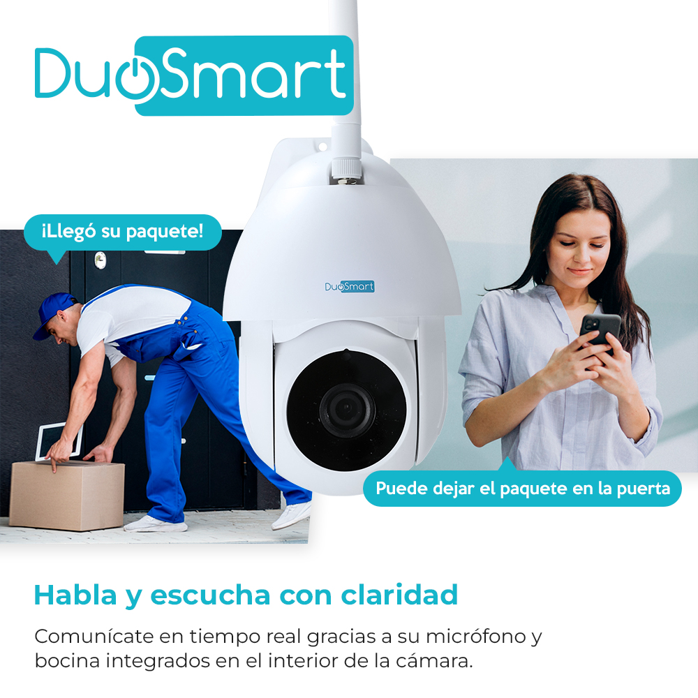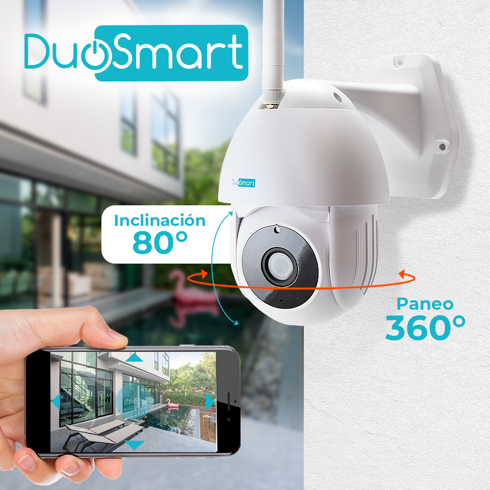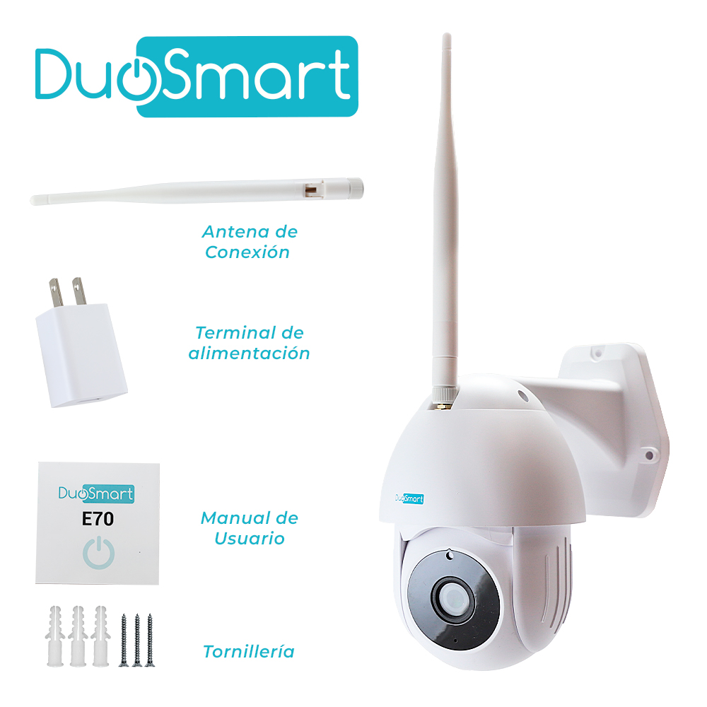 Cámara Inteligente WiFi PT Duosmart E70 para Exterior Si necesitas una cámara inteligente con movimiento para enfocar cualquier lugar que desees, la E70 de DuoSmart es la solución ideal. Esta cámara cuenta con Pan y Tilt (PT), lo que significa que puedes controlar su orientación hacia arriba, abajo, izquierda y derecha directamente desde la aplicación DuoSmart en tu dispositivo móvil. La E70 puede grabar clips de video por detección de movimiento o grabación continua en una tarjeta de memoria microSD (no incluida) de hasta 128GB. Podrás revisar estas grabaciones en tu smartphone de manera sencilla. Además, gracias a su micrófono y altavoz incorporados, podrás comunicarte de forma bidireccional a través de tu teléfono móvil, lo que te permite interactuar con las personas o mascotas en tu hogar desde cualquier lugar. La visión nocturna de la E70, potenciada por los LEDs infrarrojos, garantiza una vigilancia efectiva incluso en la oscuridad. Esta cámara es compatible con los asistentes virtuales Alexa y Google Assistant, lo que te permite visualizar la transmisión de la cámara en dispositivos con pantalla de cualquiera de estos asistentes (requiere la activación del servicio en la página duosmart.mx). Configurar la E70 es muy sencillo. Puedes agregarla a tu cuenta en la aplicación Duosmart desde cualquier ubicación a través de una conexión WiFi de 2.4 GHz y luego llevarla a donde desees. También tienes la opción de alimentarla y conectarla mediante un cable de red gracias a su puerto RJ45 incluido. ¡La E70 de DuoSmart es la cámara inteligente más completa para tus necesidades de seguridad y vigilancia!