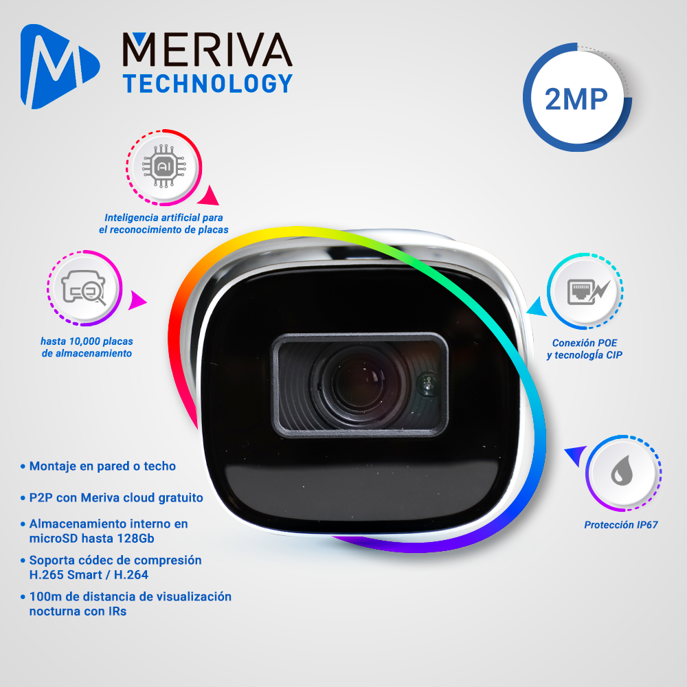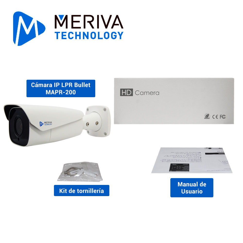 CAMARA IP BULLET LPR MERIVA TECHNOLOGY MAPR-200 / 2MP / H.265+ / LENTE MOTORIZADO 7 - 22MM / 70 - 100M IR / IP67 / METALICA / 12 VCD / POE / SOPORTA MICRO SD HASTA 256 GB (NO INCLUIDA) / 1 ENTRADA + 1 SALIDA DE AUDIO / 1 ENTRADA + 1 SALIDA DE ALARMA / SALIDA BNC / ONVIF / ANALITICA RECONOCIMIENTO DE PLACAS HASTA 10,000 PLACAS (NO REQUIERE NVR)