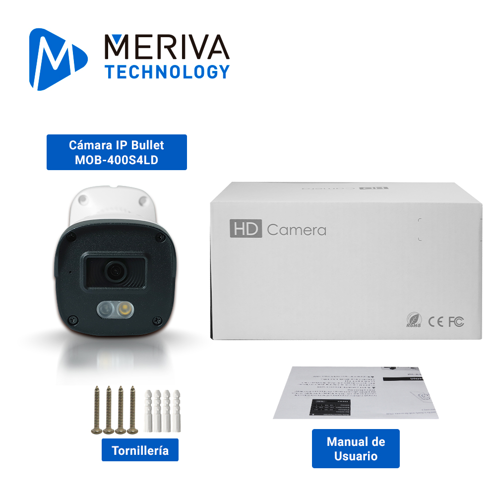 CÁMARA IP BULLET MERIVA TECHNOLOGY MOB-400S4LD / 4 MP / ILUMINACIÓN DUAL La cámara Bullet Meriva MOB-400S4LD cuenta con una resolución 4 MP, está diseñada para soluciones de Video IP que requieren de la inteligencia artificial. Cumple con el protocolo TCP/IP, UDP, RTSP, etc. Alcanza hasta 30 m de IR y 20 m de luz blanca, cuenta con tecnología Plug and Play en su conexión PoE (802.3 af). Caracteristicas: Resolución de 4 MP (2560 x 1440)@30 fps. Soporta doble stream. Micrófono integrado. Hasta 20 m de iluminación por IR y/o luz blanca. Protección IP67. Analiticos basados en MIA 2.0 (Humanos). Alimentación: 12 VCD o PoE (802.3 af). ¿Que es Iluminación Dual?La iluminación dual permite a la cámara adaptarse a diferentes condiciones de iluminación para ofrecer una vigilancia efectiva las 24 horas del día. La capacidad de cambiar entre la captura a color durante el día y la visión nocturna en B/N o color durante la noche, lo cual mejora significativamente la versatilidad y la efectividad de la cámara de seguridad en diversas situaciones.