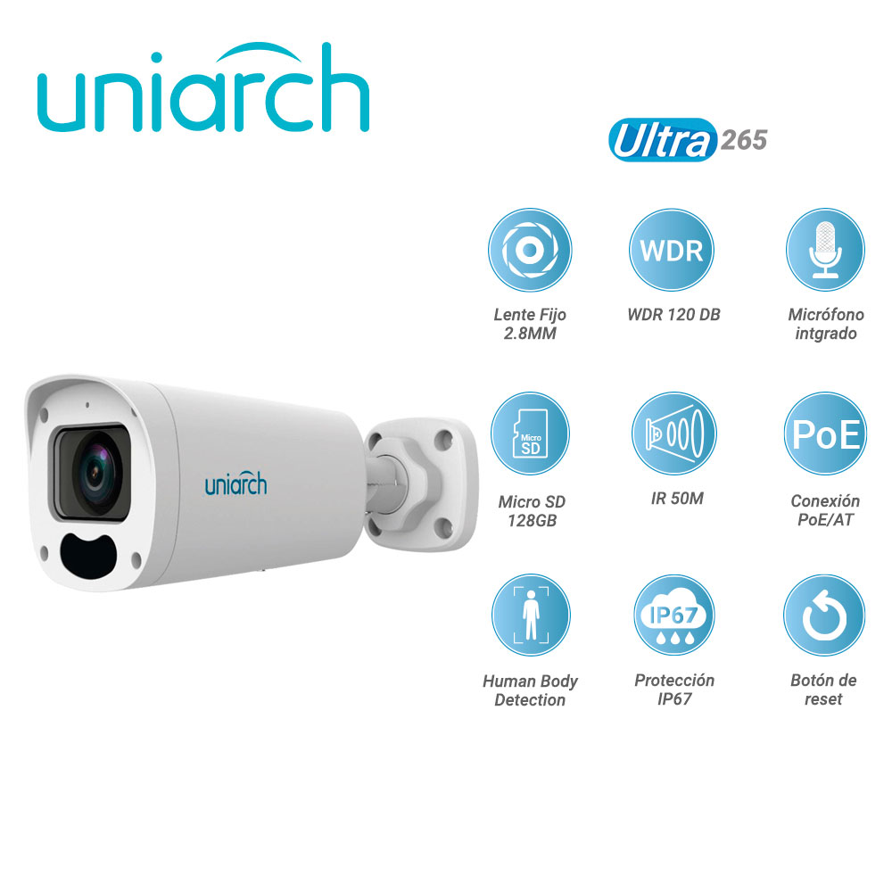 CÁMARA IP BULLET IPC-B312-APKZ UNIARCH / 2 MP / LENTE MOTORIZADO Impulsado por tecnologías de video avanzadas, Uniarch ofrece productos fáciles de usar y rentables, que van desde sistemas de cámaras de seguridad IP hasta dispositivos de videoconferencia, para el hogar y las PYMES en todo el mundo. Caracteristicas: Resolución: 2 MP (1920*1080). Lente: 2.8 mm ~ 12 mm. Funcionalidad día/noche. IR Inteligente, hasta 50 m (164 pies) de distancia IR. Ventana de vidrio óptico con mayor transmisión de luz. Ventana antirreflectante IR para aumentar la transmitancia infrarroja. 2D/3D DNR (reducción de ruido digital). Micrófono integrado. Protección IP67. Ultra 265, H.265, H.264. ONVIF Slot de MicroSD hasta 128 GB. Amplio rango de temperatura: -30 °C ~ 60 °C (-22 °F ~ 140 °F).