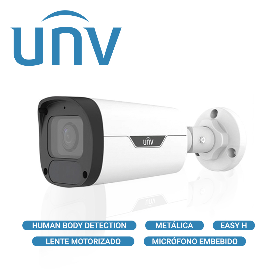 CÁMARA IP BULLET ULTRA265 UNV IPC2322LB-ADZK-H / 2 MP LENTE MOTORIZADO DE 2.8 MM-12 MM Cámara IP Bullet Alta Definición de 2 MP con compresión ULTRA 265: más video en menos espacio; tiene un lente motorizado de 2.8 mm a 12 mm y alcanza 50 m con sus Leds Infrarrojos es ideal para interior/exterior gracias a su resistencia IP67. Los productos de la serie Easy son la opción más popular para las aplicaciones básicas, tales como residencias y pequeños comercios. Todas cuentan con la tecnología de comprensión Ultra 265 desarrollada exclusivamente por Uniview. Además, los productos de la serie Easy son muy fáciles de instalar y mantener, lo que les permite ser utilizados en cualquier lugar en tan solo unos segundos. Los productos de la serie Easy son la opción más rentable para las aplicaciones residenciales y las pequeñas empresas. Caracteristicas: Alta calidad de imagen 2 MP (1920 x 1080)@30 fps. Ultra 265, H.265, H.264, MJPEG. IRs inteligentes, hasta 50 m (164 ft). Real WDR 120 dB. Soporta modo corredor 9:16. Slot MicroSD, hasta 256 GB. Micrófono integrado. Protección IP67. Alimentación: 12 VCD o PoE (802.3 af).