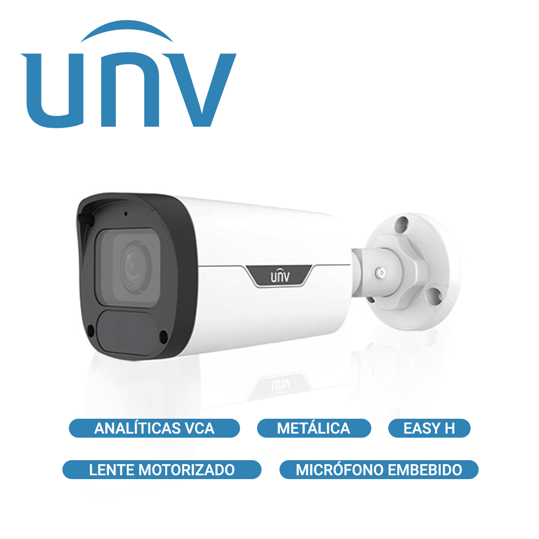 CÁMARA IP BULLET UNV IPC2324LB-ADZK-H / 4 MP LENTE MOTORIZADO DE 2.8 MM-12 MM Cámara IP Bullet Alta Definición de 4 MP con compresión ULTRA 265: más video en menos espacio; tiene un lente fijo de 2.8 a 12 mm y alcanza 50 m con sus Leds Infrarrojos es ideal para interior/exterior gracias a su resistencia IP67. Los productos de la serie Easy son la opción más popular para las aplicaciones básicas, tales como residencias y pequeños comercios. Todas cuentan con la tecnología de comprensión Ultra 265 desarrollada exclusivamente por Uniview. Además, los productos de la serie Easy son muy fáciles de instalar y mantener, lo que les permite ser utilizados en cualquier lugar en tan solo unos segundos. Los productos de la serie Easy son la opción más rentable para las aplicaciones residenciales y las pequeñas empresas.