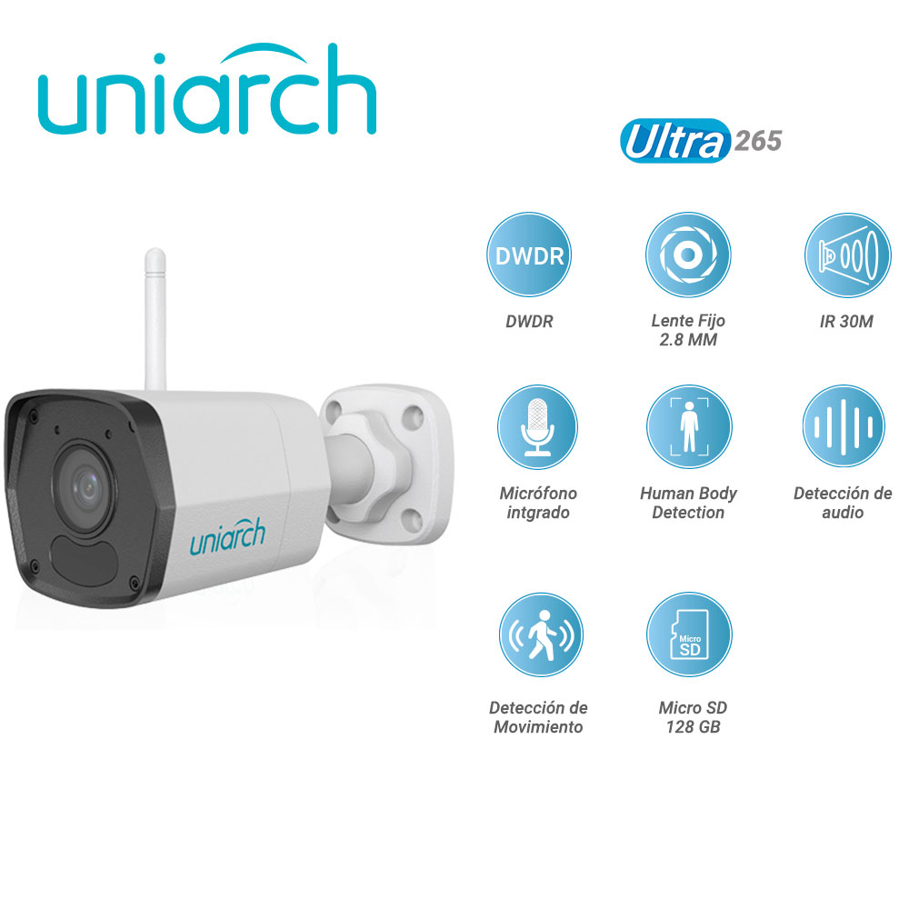 CAMARA IP BULLET WIFI UNIARCH UHO-B1R-M2F3 / 2MP / ULTRA265 / 12 VCD / DWDR / LENTE FIJO DE 2.8 MM / IR HASTA 30M / MICROFONO INTEGRADO / HUMAN BODY DETECTION / DETECCION DE AUDIO / DETECCION DE MOVIMIENTO / RANURA PARA MICRO SD HASTA 128 GB
