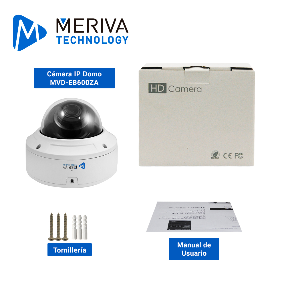 CÁMARA IP DOMO MERIVA TECHNOLOGY MVD-EB600ZA / 6 MP / 2.8 - 12MM / ANALITICOS INTELIGENTES La cámara Domo Meriva MVD-EB600ZA cuenta con una resolución 6 MP, está diseñada para soluciones de Video IP que requieren de la inteligencia artificial. Cumple con el protocolo TCP/IP, UDP, RTSP, etc. Alcanza hasta 50 m de IR, cuenta con tecnología Plug and Play en su conexión PoE (802.3 af). Caracteristicas: Resolución 6 MP (3296 x 1856) @ 30 fps. Códec de compresión 265 / H.265 / H.264 / H.264. Día / Noche automático ICR. Visualización nocturna 30 ~ 50 m infrarroja. Funciones integradas como Real WDR 120 dB, 3DNR, HLC, BLC entre otras. Soporta tres stream. Entrada y salida de audio. Entrada y salida de alarma. Micrófono integrado. Salida de video CVBS. Alimentación 12 VCD / PoE (802.3 af). Soporta Micro SD, de hasta 256 GB (memoria no incluida). Protección IP67 e IK10. DDNS mymeriva.com gratuito. Conexión P2P Meriva Technology. Analíticos con inteligencia artificial. Protección IP67. Compatible con iOS y Android. Software NVMS 2.0 gratuito. Soporta Reset por botón.