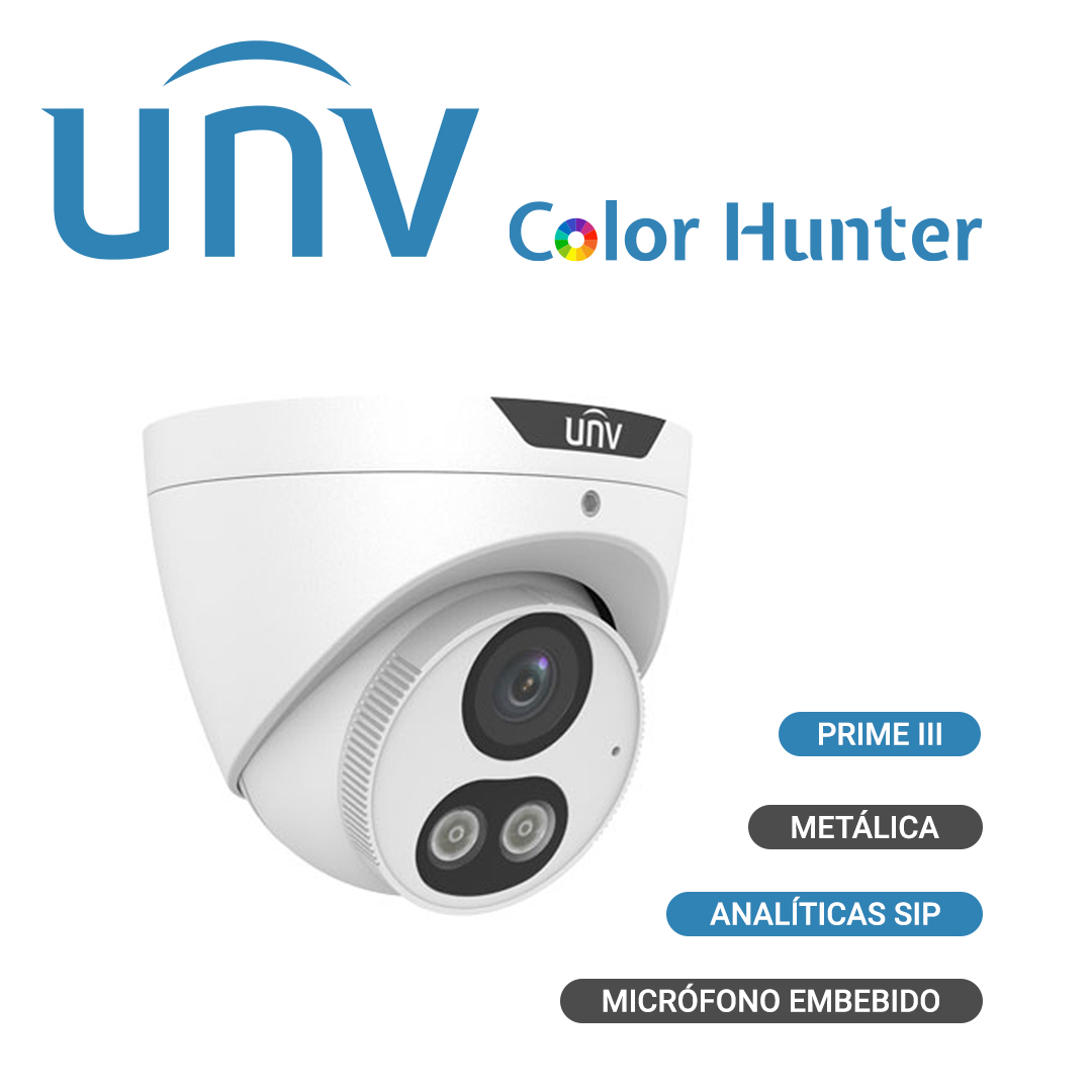 Cámara IP Domo Turret de Alta Definición de 5 MegaPixeles con compresión ULTRA 265: más video en menos espacio; Permite corregir la imagen en condiciones de iluminación extrema gracias a la sensibilidad del WDR 120dB WDR tiene un lente fijo de 2.8mm y alcanza 30m con sus Leds Infrarrojos es ideal para interior/exterior gracias a su resistencia IP67. Nuevo sensor Color Hunter