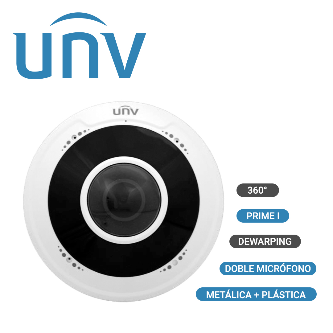 CAMARA IP FISHEYE 360GRADOS 5MP UNV IPC815SB-ADF14K-I0 Cámara IP Fisheye de 360 grados con resolución de 5MP cuenta con un lente de 1.4mm, tiene micrófono integrado y cuenta con leds infrarrojos de hasta 10m con 6 vistas, función Dewarping y compresión Ultra265.