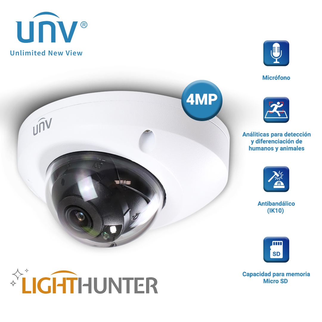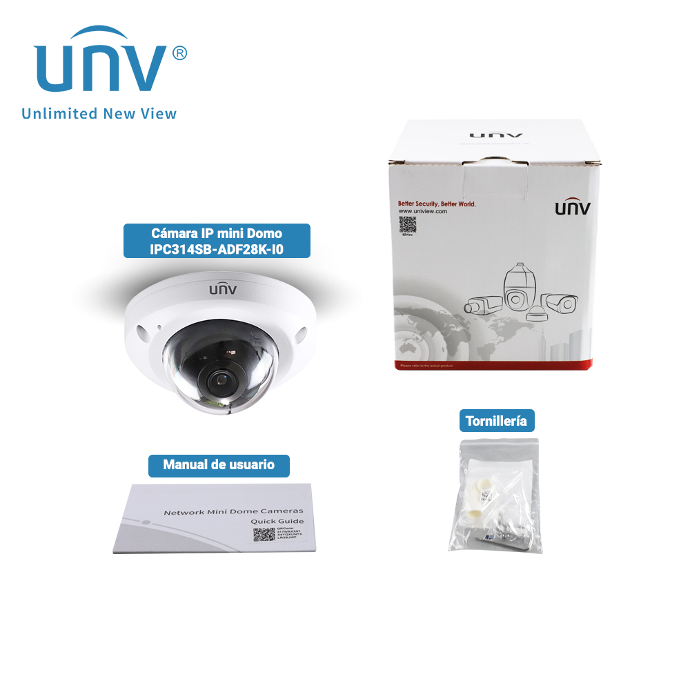 CÁMARA IP MINI DOMO ULTRA265 UNV IPC314SB-ADF28K-I0 / 4MP LENTE FIJO DE 2.8MM / RANURA MICRO SD / WDR 120DB / IP67 / 30M IR / METALICA / MICROFONO EMBEBIDO / 1 ENTRADA Y 1 SALIDA DE AUDIO / ANALITICAS SMART INTRUSION PREVENTION IA / LIGHTHUNTER Cámara IP Domo Alta Definición de 4 MegaPixeles con compresión ULTRA 265: más video en menos espacio; tiene un lente fijo de 2.8 y alcanza 30m con sus Leds Infrarrojos es ideal para interior/exterior gracias a su resistencia IP67 y resistente al vandalismo IK10.