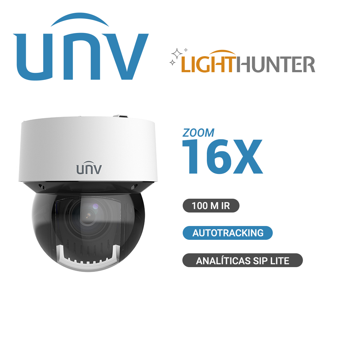 CAMARA IP MINI PTZ LIGHTHUNTER ULTRA265 UNV IPC6434LR-X16-VG1 / 4 MP / LENTE MOTORIZADO 5.5 - 88 MM / ZOOM 16X / IK10 La nueva cámara minI PTZ IPC6434LR-X16-VG1 de 4 MP cuenta con protección de IK10 siendo una PTZ ideal para exterior gracias a su protección del domo de cristal templado, adicional a esto el paneo es de 360° sin fin permitiendo tener una rotación continua sin ninguna interrupción en la vigilancia. Cuenta con analíticos de Human Body Detection evitando las falsas alarmas y al complementarlo con la tecnología Lighthunter aprovecha al máximo la captación de luz del entorno. CARACTERISTICAS Imagen de alta calidad con sensor CMOS de 4MP, 1/2,9" 2688*1520@30fps en la corriente principal Ultra 265, H.265, H.264, MJPEG000 Flujos duales Zoom óptico de 16X La tecnología LightHunter garantiza una calidad de imagen ultra alta en entornos con poca iluminación IR inteligente, hasta 100 m (328 pies) de distancia IR 12 VCD±10% o PoE (802.3cat) Alarma de 2 entradas y 1 salida, audio de 1 entrada y 1 salida Protección IP66 IK10 antivandálico