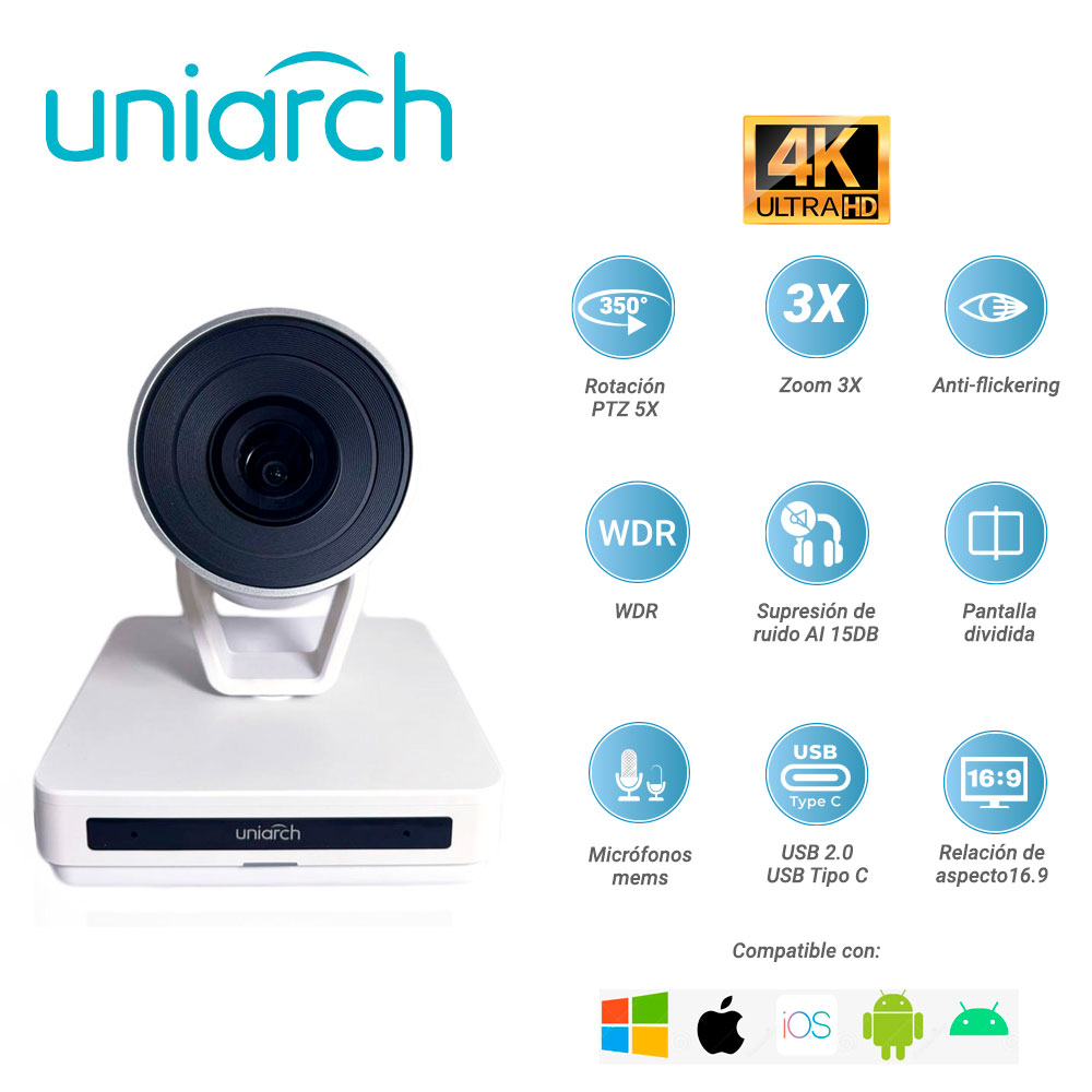 CAMARA PARA VIDEO CONFERENCIA UNIARCH V50 / 4K / 8MP / 350 GRADOS ROTACION PTZ 5X OPTICAL ZOOM / 3X DIGITAL ZOOM / ANTI-FLICKERING / TRUE WDR / SUPRESION DE RUIDO CON IA 15 DB / SEGUIMIENTO VOZ / PANTALLA DIVIDIDA DE PRIMER PLANO Y OTROS MODOS MÚLTIPLES OPCIONALES / MICROFONOS MEMS / USB 2.0, USB TIPO C / RELACION DE ASPECTO 16:9 / COMPATIBLE CON WINDOWS/ LINUX / MAC/ OS / 12V-1.5A