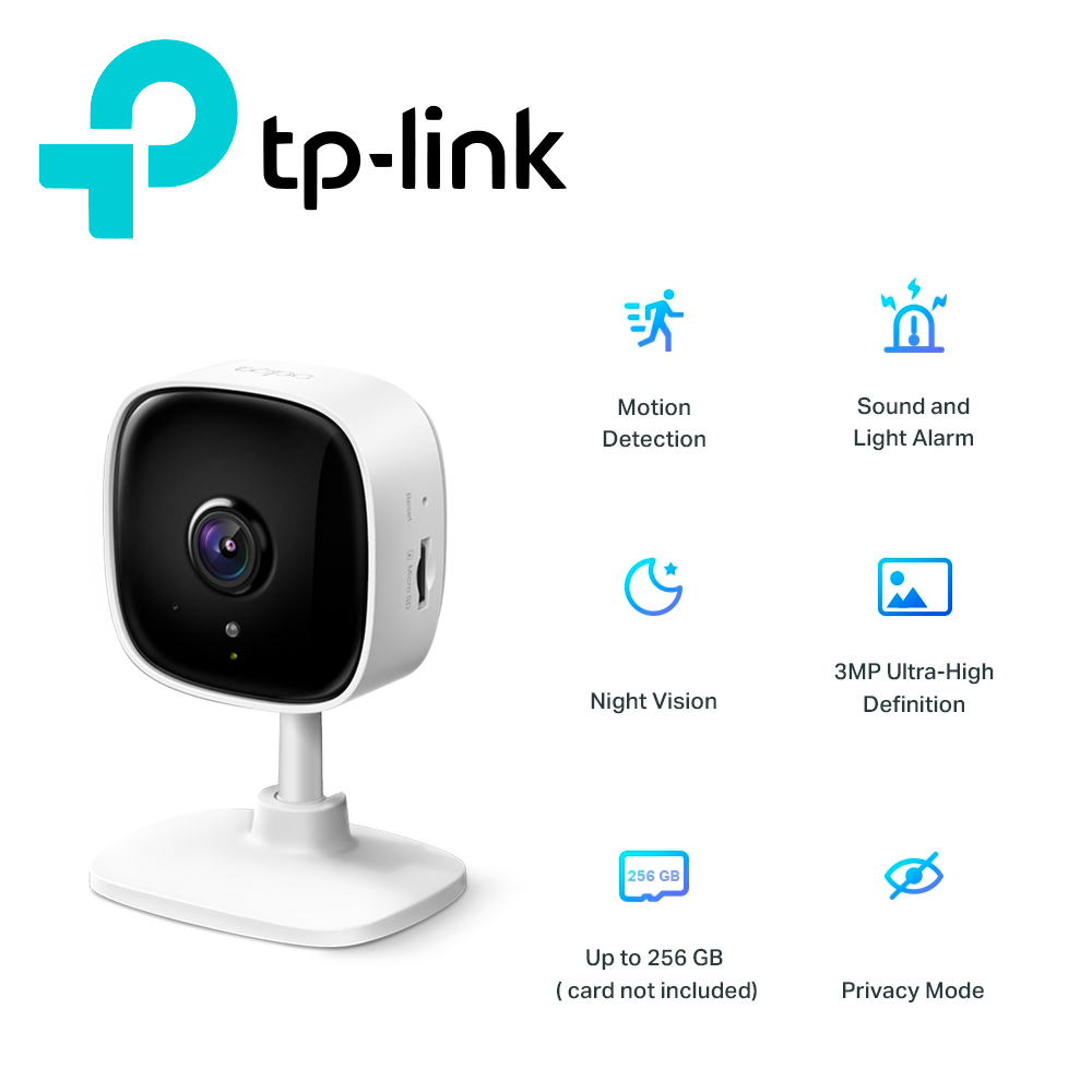 Cámara TAPO C110 - TP-Link. Cámara Wi-Fi de seguridad para el hogar. Video de ultra alta definición: graba cada imagen en una definición ultra alta de 3MP Visión nocturna avanzada: proporciona una distancia visual de hasta 30 pies Detección de movimiento y notificaciones: le notifica cuando la cámara detecta movimiento Alarma de luz y sonido: active los efectos de luz y sonido para ahuyentar a los visitantes no deseados Audio bidireccional: permite la comunicación a través de un micrófono y un altavoz integrados Almacenamiento seguro: almacena localmente hasta 256 GB en una tarjeta microSD, lo que equivale a 512 horas (21 días) de metraje (según las condiciones del laboratorio) Fácil configuración y administración: administre todo con la aplicación Tapo