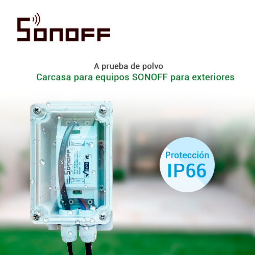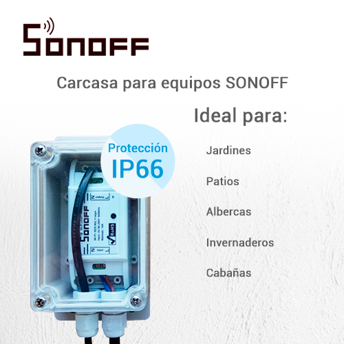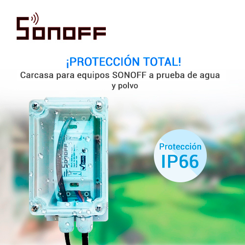 Sonoff Carcaza IP66Carcasa Sonoff a prueba de agua te permite montar los dispositivos de la linea Sonoff en intemperie, gracias a su diseño con certificación IP66 la protección del dispositivo al interior será total.Este accesorio es ideal para montar los dispositivos sonoff en locaciones donde hay humedad y polvo, por ejemplo: en jardines, patios, cerca de fuentes y albercas, invernaderos, iluminación exterior, cabañas, etc.Cabe destacar que la carcasa sonoff a prueba de agua no permite la inmersión en agua, solamente brinda protección contra chorros de agua potentes y polvo.Especificaciones: Nivel impermeable: IP66 Material del Cuerpo: ABS V0 Transparente Material de la cubierta: PC V0 Dimensiones: 13.2 x 6.9 x 4.8 cm (132.2 x 68.7 x 50.1 mm) (largo x ancho x alto). Peso: 145.0 g Compatible con: Sonoff Basic Sonoff RF Duosmart B10