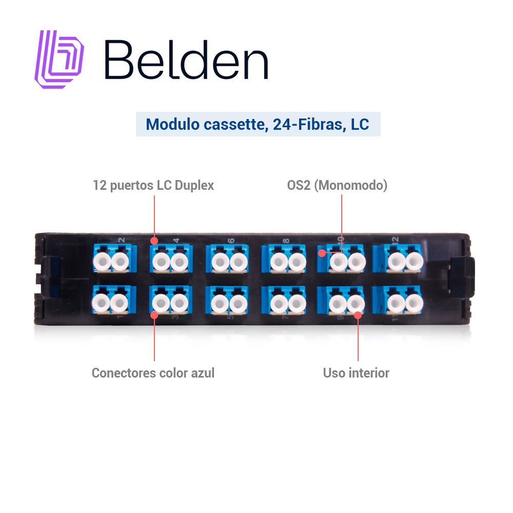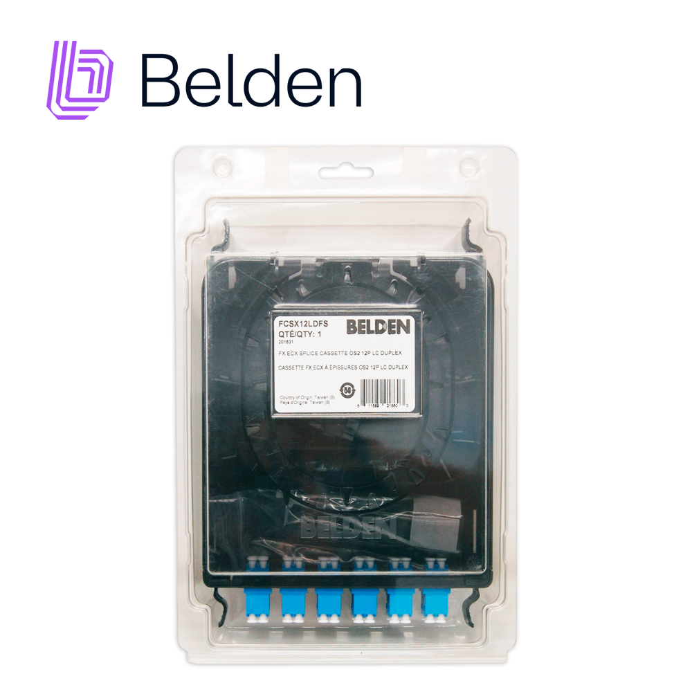 FCSX12LDFS BELDEN Modulo cassette, 24-Fibras, LC 12 puertos LC Duplex Tipo de fibra OS2 (Monomodo) conectores color azul Uso interior Partes relacionadas:FX ECX Panels, FX Pigtails, FX Brilliance, Belden Splice Ideal para charola de fibra optica ECX-01U, ECX-02U