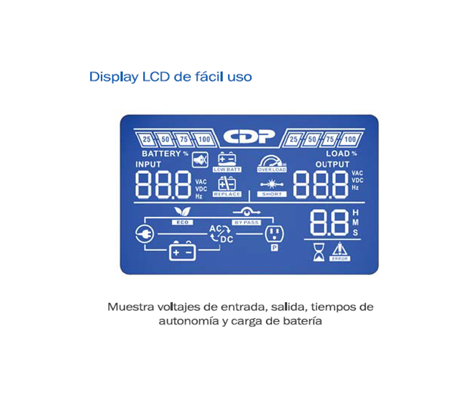 - Alarmas y notificaciones: Incluye alarmas sonoras y visuales para alertarte sobre problemas como cortes de energía, batería baja o sobrecarga.