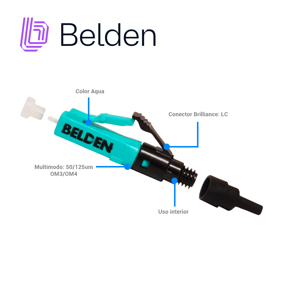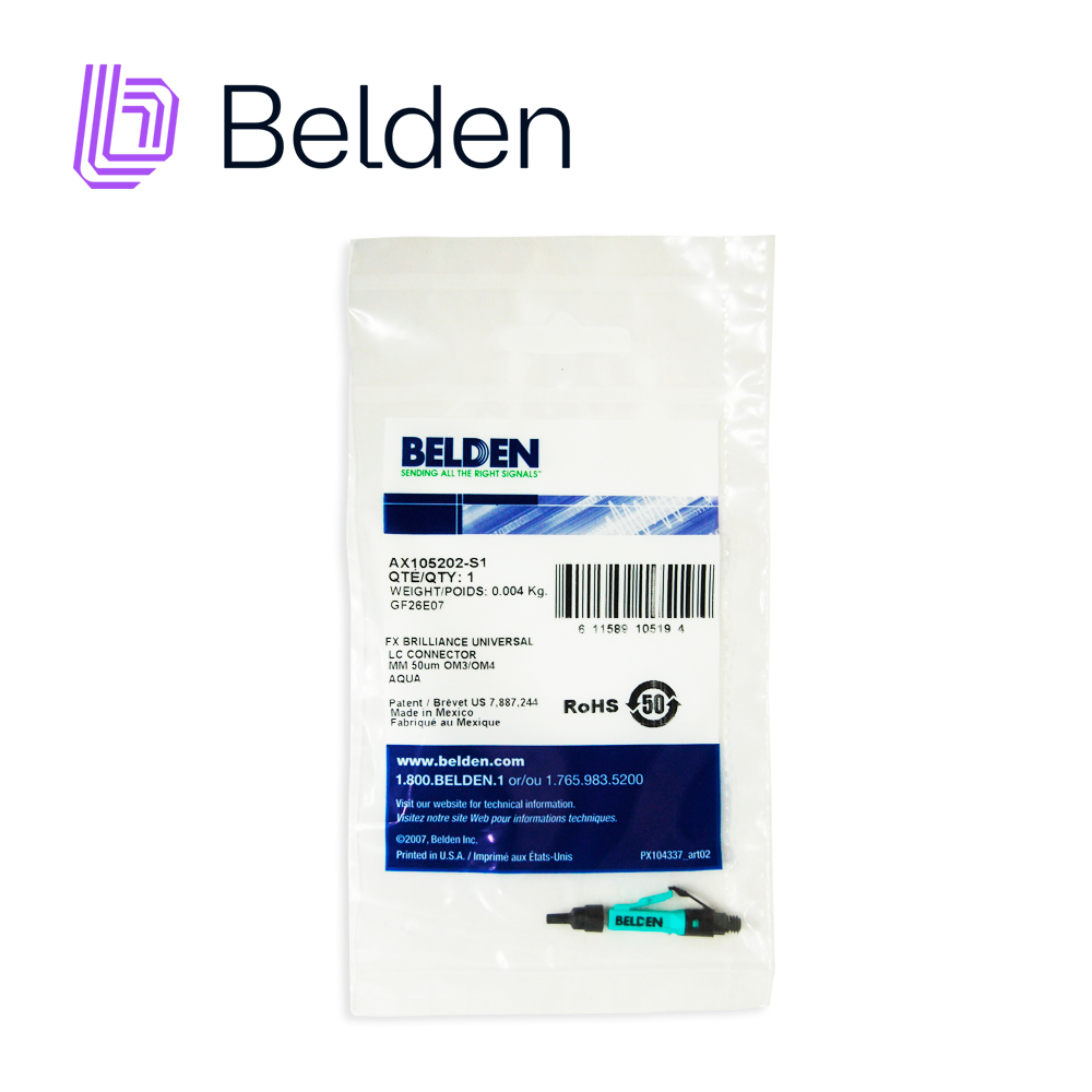 AX105202-S1 BELDEN FX Brilliance Conector universal instalable en campo LC, multimodo, OM3-OM4, Aqua Housing, 1 / paquete, con soporte para 250 um (con kit de desprendimiento), 900 um, 2 mm y fibra de 3 mm (con botas con forro). Incluye una bota de 900 um, otros accesorios (kit de desprendimiento y botas con camisa) que se venden por separado. Conector de fibra Brilliance: LC Multimodo: 50/125um OM3/OM4 Color: Aqua Uso interior Compatible con kit de terminado brillance