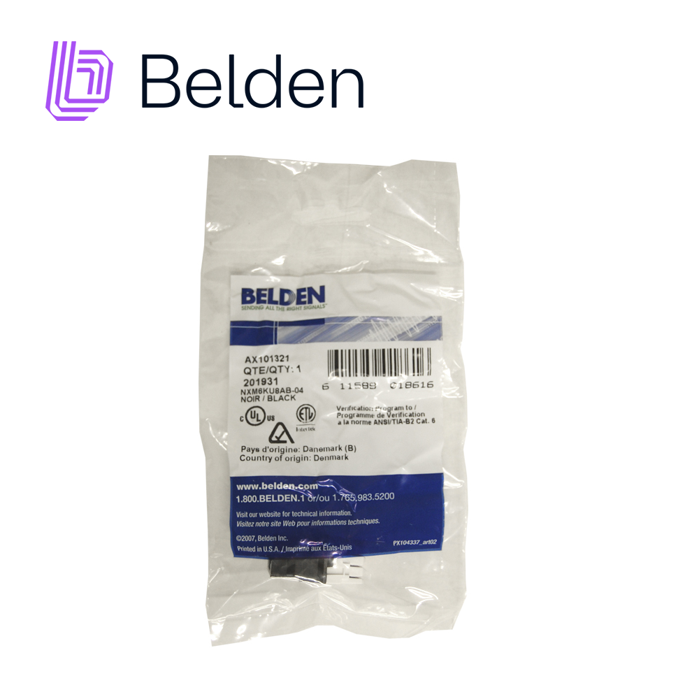AX101321 BELDENJack modular RJ-45 categoria 6 Espacio ambiental: Interior Aplicaciones adecuadas: Sistema IBDN 2400, 3600 y 4800, TIA Categoría 6 , ISO Clase E, 1000 BASE-T Características físicas (en general) Altura:0.88 in Anchura:0.64 in Profundidad:1.29 in Esquema de cableado:T568A / B Tipo:KeyConnect Compatibilidad de herramientas:Herramienta de conexión Belden 110, estación de terminación MediaFlex Partes relacionadas:Compatible con las placas frontales, adaptadores, cajas y paneles de conexión de KeyConnect Color Negro