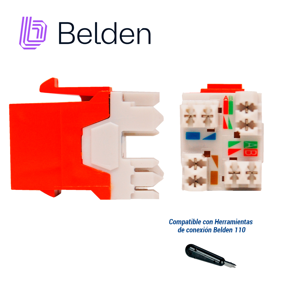 CONECTOR MODULAR JACK RJ45 CAT6A BELDEN AX104152 ESTILO KEYCONNECT NARANJA COMPATIBLE CON FACEPLATE AX102660,AX102655,AX102249 PATCH PANEL MODULAR AX103114,AX103115,AX104599 ESQUEMA DE CABLEADO T568A/B HERRAMIENTA COMPATIBLE AX100749 USO INTERIOR CALIBRE DEL CONDUCTOR 22-24 AWG