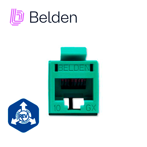 RVAMJKUGN-S1 BELDENJack revconnect categoria 6a color verde uso interior Aplicaciones adecuadas Sistema 10GX, TIA Categoría 6A, ISO Clase EA, 10GBASE-T Esquema de cableado: T568A / B Embalaje: Empaquetado individualmente en una bolsa de plástico. Tipo: KeyConnect Compatibilidad de herramientas: Herramienta de terminación REVConnect (p / n RVUTT01) Jack Compatibilidad: RJ45, RJ11 Categoría de datos: Categoría 6A Partes relacionadas: Compatible con placas frontales, adaptadores, cajas y paneles de conexión KeyConnect color verde