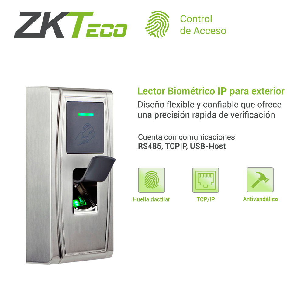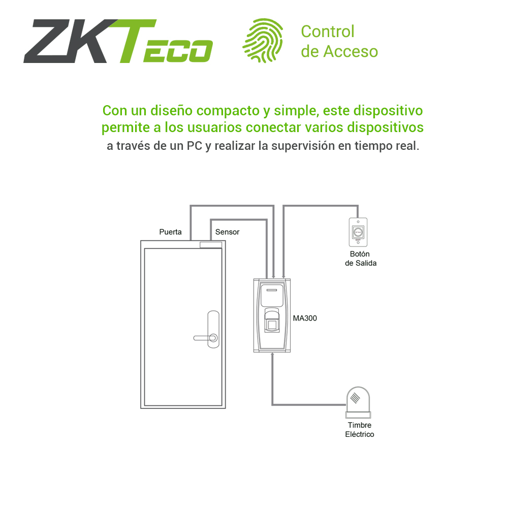 ZKTeco MA300 MA300 es un innovador lector biométrico de huella digital para aplicaciones de control de acceso el cual adopta el avanzado algoritmo de ZK para ofrecer confiabilidad, precisión y rápida velocidad de verificación. Su cubierta metálica y protección IP65 lo hacen resistente al agua, polvo y daños externos. Software Grauito de Administracion: ZKBio CVAccess El MA300 ofrece flexibilidad para ser instalado de manera autónoma o con paneles de control de acceso que soporten formato Wiegand de 26 bits. Los usuarios puede ser registrados mediante una tarjeta de administrador cuando el dispositivo funciona en modo autónomo.Cuenta con interfaz TCP/IP y RS485 para una fácil conexión y escalabilidad