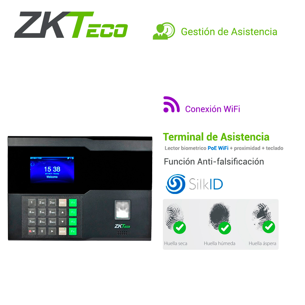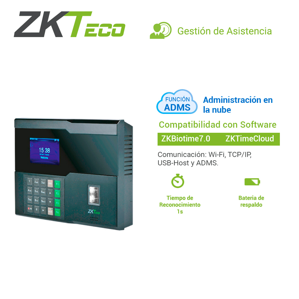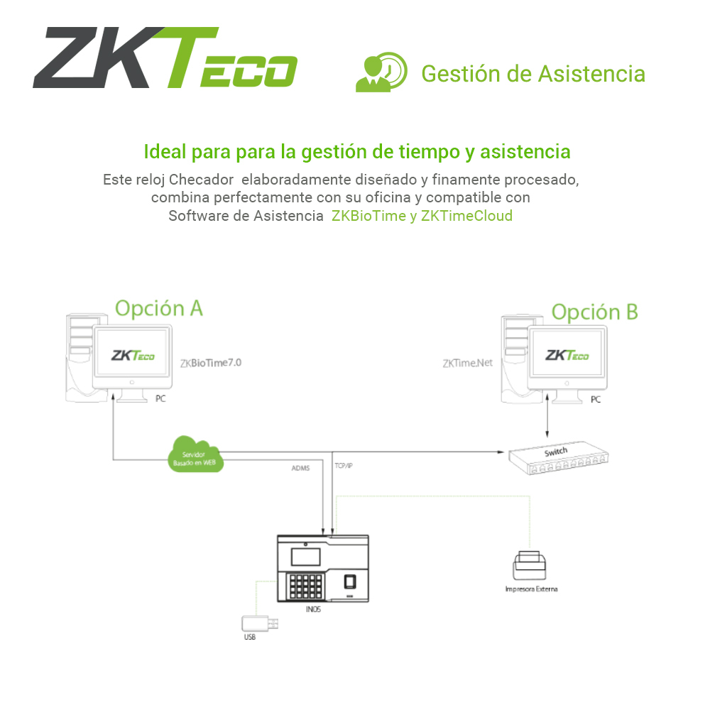 IN05 ZKTecoIN05 es un terminal de asistencia de huella dactilar con conexión POE y función ADMS compatible para los softwares BioTime Pro. Al comunicarse a través de Wi-Fi, TCPIP, ADMS, USB Host, garantiza una conexión sin problemas y transferencia de datos. Permite conectarse a través de internet al servidorsin necesidad de abrir puertos de comunicación.Conoce más sobre la función ADMS Sensor de última generación antifalsifaciónde huellas digitales.Beneficios del sensor SilkID