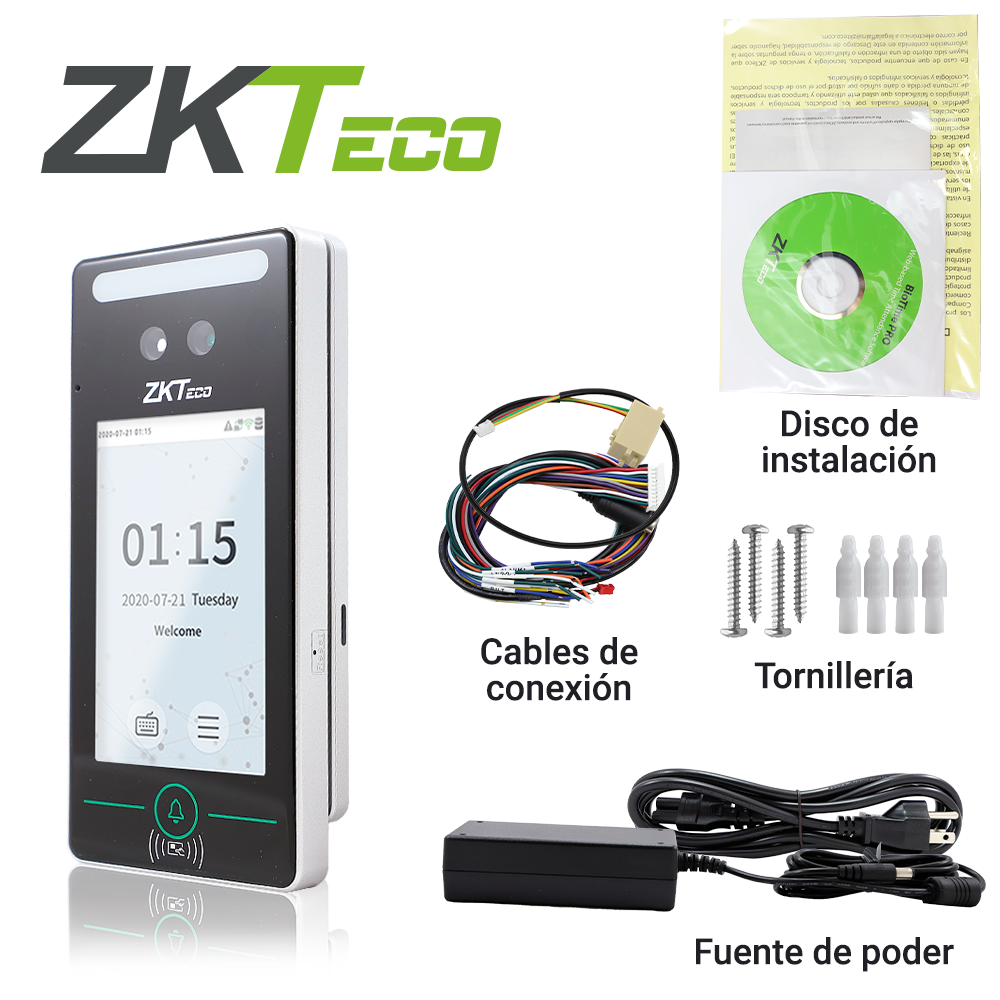 Control de acceso con reconocimiento facial Equipo de control de acceso con reconocimiento facial, palma y tarjetas con tecnología Visible Light. Reconocimiento facial con tecnología Visible Ligth Algoritmo anti-spoofing contra ataque de impresión (láser, color y fotos en blanco y negro), ataque de videos y ataque de máscara 3D Múltiples métodos de verificación: Rostro / Palma / Tarjeta / Contraseña Módulos de tarjeta disponibles: tarjeta de identificación de 125 kHz Iluminación complementaria con brillo ajustable Capacidad de 800 plantillas faciales, 800 plantillas de palma Compatible con BioTime Cloud 2.0