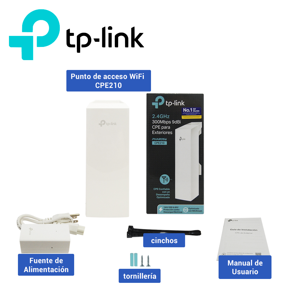 CPE de exterior de 9 dBi en 2.4GHz a 300 Mbps CPE de Exterior de 9dBi en 2.4GHz a 300Mbps: Incorpora antenas MIMO doblemente polarizadas y direccionales de 9dBi 2x2. Potencia de transmisión ajustable desde 0 hasta 20dBm. Optimizaciones de nivel de sistema para transmisión inalámbrica de larga distancia de más de 5 kilómetros de alcance. La tecnología TP-LINK Pharos MAXtream TDMA (Acceso Múltiple por División en el Tiempo) mejora el rendimiento del producto, en capacidad y latencia, siendo ideal para aplicaciones PTMP. Sistema de Gestión Centralizada Pharos Control. Modos de operaciones: AP / Cliente / Bridge/ Repetidor / Router AP / Router Cliente AP Client (WISP). Adaptador PoE pasivo permite hasta 60 metros (200 pies) de implementación PoE y permite que el dispositivo se resetee remotamente. Interfaz: 1 Puerto Ethernet blindado 10/100Mbps (LAN0, PoE Pasivo de Entrada). 1 Terminal de toma de tierra. 1 Botón de Reset. Tipo de Antena: Antena Direccional Doblemente Polarizada MIMO 2x2 de 9dBi. Ancho de Haz: 65° (Plano-H) / 40° (Plano-E). Nota: Para más detalles, por favor consulte la hoja de datos. Carcasa: Material plástico estabilizado ASA para exterior. Certificado contra agua IPX5. Velocidad Inalámbrica: Hasta 300Mbps (40MHz,Dinámico). Hasta 144.4Mbps (20MHz, Dinámico). Hasta 72.2Mbps (10MHz, Dinámico). Hasta 36.1Mbps (5MHz, Dinámico). Frecuencia: 2.4~2.483GHz. Nota: Las frecuencias operativas disponibles pueden variar dependiendo de las limitaciones de los países o regiones donde se use este dispositivo.