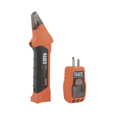 - Probador GFCI que consta de dos piezas: un transmisor conectado al tomacorrientes o accesorio eléctrico, y un receptor que se usa para escanear el cortacircuitos correcto en el panel.