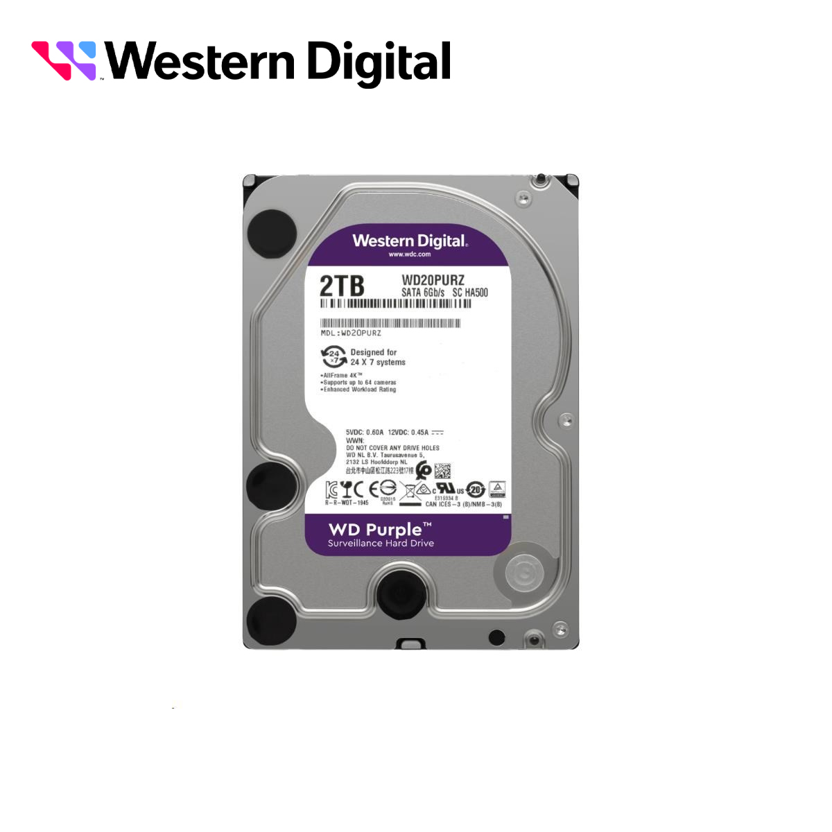 Disco duro para videovigilancia 2TB 3.5" serie Purple Almacenamiento implacable para vigilancia Los discos WD Purple están diseñados para enfrentar los desafíos que supone la grabación para videovigilancia las 24 horas del día, los 7 días de la semana. Estos discos están diseñados específicamente para la videovigilancia, con el objetivo de soportar las variaciones elevadas en la temperatura y las vibraciones en el equipo dentro de un entorno de NVR. Un disco de escritorio promedio está creado para funcionar solo en intervalos cortos y no en el entorno severo de funcionamiento continuo las 24 horas, los 7 días de la semana de un sistema de videovigilancia de alta definición. Con los discos WD Purple, obtiene almacenamiento confiable, específico para videovigilancia y compatible con una amplia variedad de sistemas de seguridad. La exclusiva tecnología AllFrame ayuda a reducir la pérdida de cuadros y a mejorar la reproducción general de los videos.