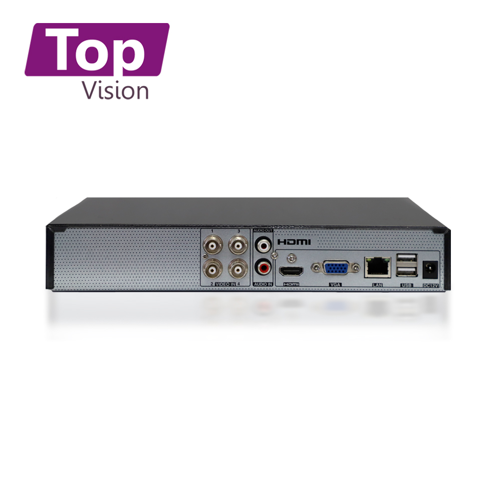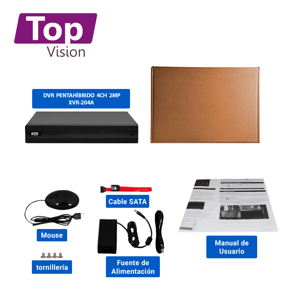 DVR TOP VISION XVR-204A / 2 MP / H.265 / 6 CH ( 4 CH BNC 2 IP) / PENTA HIBRIDO / SOPORTA AUDIO SOBRE COAXIAL (SOLO EN TVI) El XVR-204A es un DVR penta híbrido que soporta los formatos de video AHD, TVI, CVI, análogo e IP; en sus 4 canales BNC 2 canales IP permite una resolución de 2 MP todo en un mismo equipo para obtener la máxima compatibilidad y resolución. El equipo permite resoluciones de grabación de hasta 2 MP Lite además incluye entrada y salida RCA para tener audio bidireccional. Para un control mayor de ancho de banda y ahorro de almacenamiento maneja un códec de compresión H.265. Soporta audio sobre coaxial con cámaras con micrófono integrado unicamente en tecnología TVI. Caracteristicas: Soporta 4 CH entrada BNC 2 MP / 1 MP@30 fps Soporta 2 CH IP entrada por red hasta 2 MP@30 fps. Salida de video HDMI y VGA Full HD. Audio bidireccional RCA. Soporta Audio por coaxial (Solo en TVI). DDNS mymeriva.com gratuito. Transmisión P2P Meriva Cloud gratuito. Almacenamiento 1 SATA de hasta 8 TB. Software N9000 embebido. Códec de compresión H.265. Compatible con iOS y Android. Software NVMS2.0 gratuito. Control PTZ por protocolo CoC. Alimentación: 12 VCD 1.5 A.