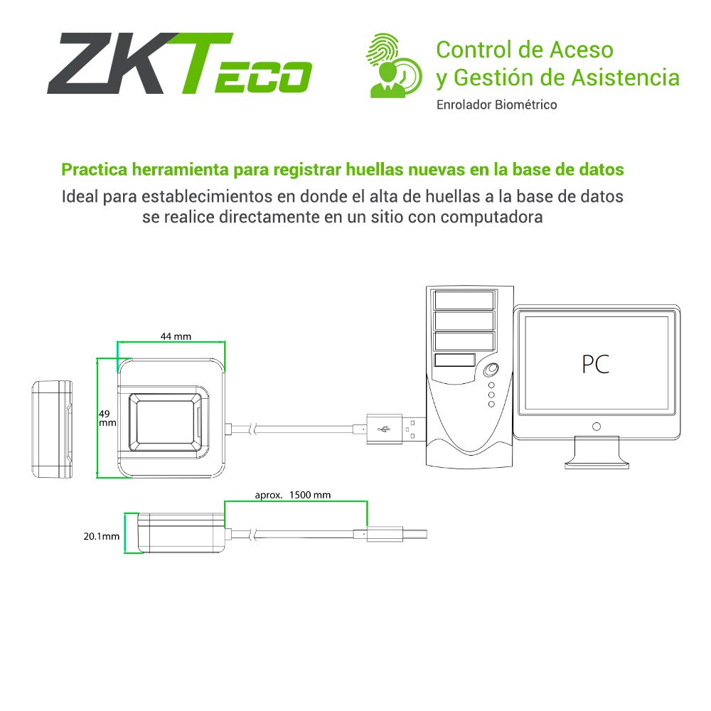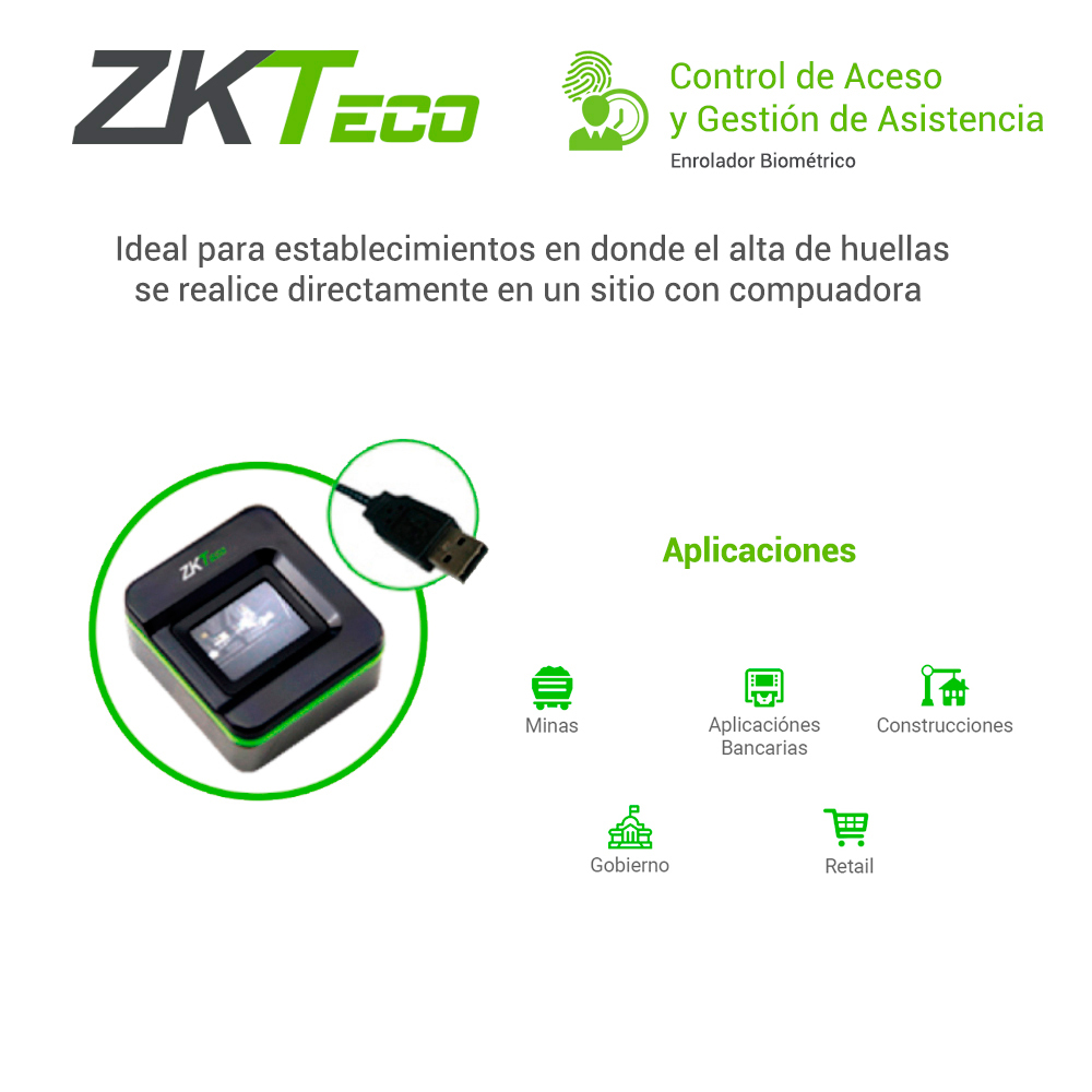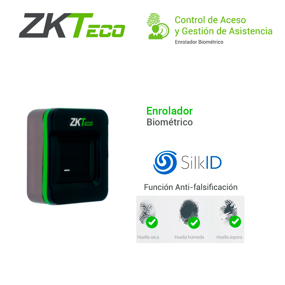 SLK20R ZKTecoEl SLK20R es la mejor opción en cuanto a un dispositivo de escritorio para enrolar e identificar debido a su comodidad y asequibilidad cuenta con la tecnología más avanzada con el nuevo sensor SilkID.La identificación de personas por medio de la huella digital, es ahora: más precisa, rápida y de bajo costo.SLK20R es un potente sensor de huellas digitales diseñado por el laboratorio de ZKTeco en Sillicon Valley, Estados Unidos el cual adopta un avanzado diseño óptico.Cuenta con las certificaciones PIV Single Finger Capture Device y PIV Mobile ID FAP20 del FBI lo que lo aprueba como un dispositivo con avanzada habilidad para detección de huellas falsasy captura de imágenes de las huellas digitales con una alta calidad de 2 megapíxeles.Características: Operación estable bajo luz intensa. Función anti-falsificación de huellas digitales. Amplia zona de captura de huellas y alta calidad de imagen. Reconocimiento rápido de huellas secas, ásperas y húmedas. USB 2.0 de alta velocidad. Modo de reposo. SDK disponible para desarrolladores.