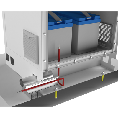 Gabinete de Piso para Exterior con Ventiladores y Termostato con Rack de 19' de 16 Unidades + Espacio para instalación de 2 Baterías de Respaldo en el Fondo.
