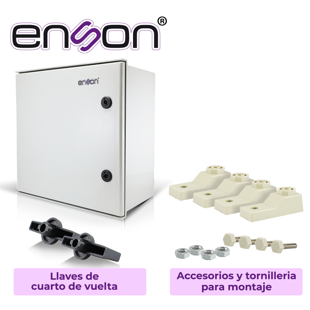 ENS-NEM442 ENSON Gabinete Tipo NEMA Resistencia contra oxidación y corrosión por condiciones químicas y atmosféricas Fácil instralación y manipulación debido a su ligereza Puerta Sólida de Polietileno Color Gris Temperatura en Operación: -40° a 120°C Impacto Mecánico: IK08 Dimensiones: 400x400x200 El Gabinete Tipo NEMA Incluye: Puerta con Sistema de Bloqueo Placa de montaje para pared de poliester Kit de Brackets