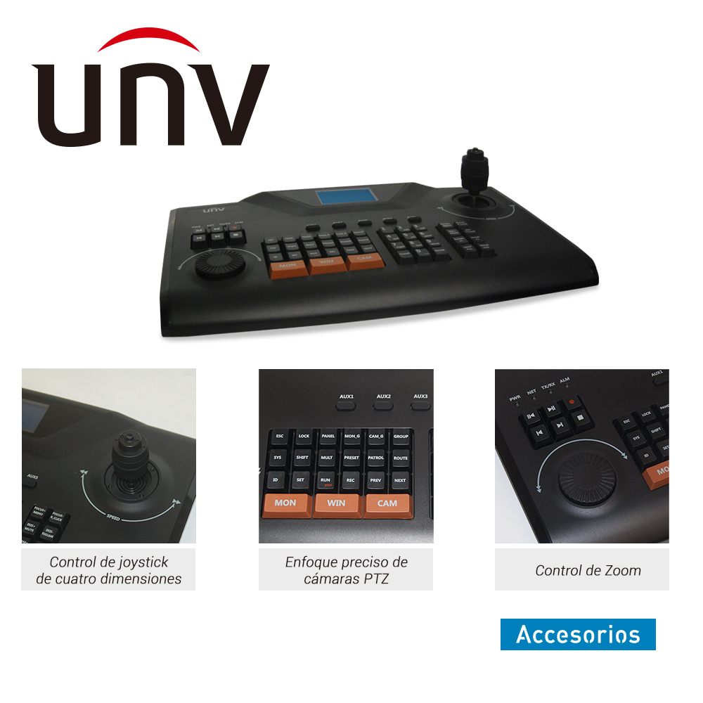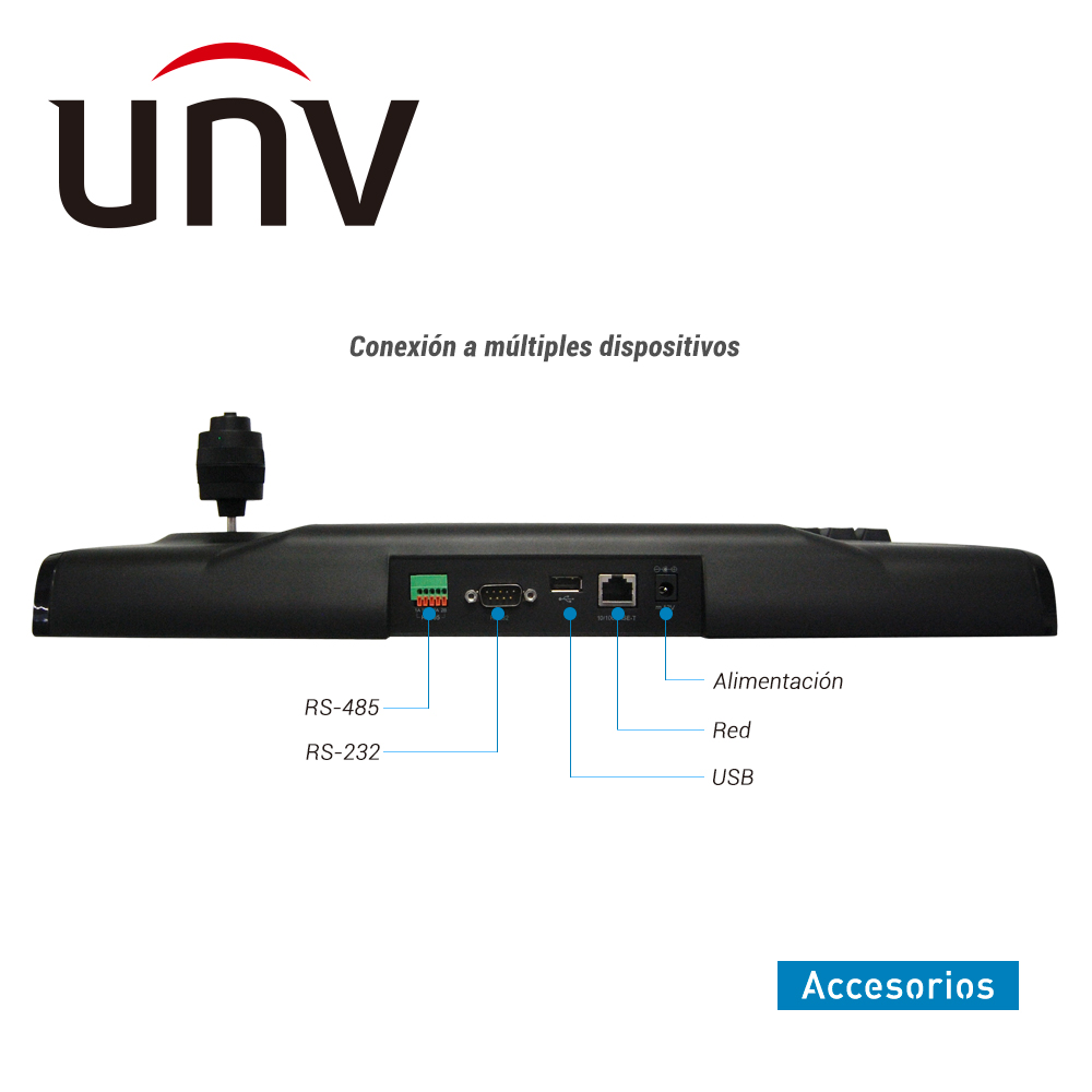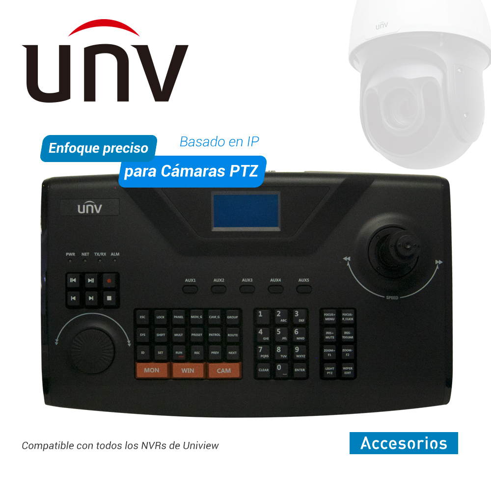 KB-1100 UNIVIEW Teclado joystick UNV diseñado para el control de zoom y enfoque preciso de cámaras PTZ compatible con todos los NVR de UNV y con el software EZStation. Este dispositivo es compatible con todos los NVR de UNV, UNICORN, SPEED DOMES, CÁMARAS CON LENTES MOTORIZADOS, CAMARAS CON LENTES ZOOM, MINI PTZ. **No es compatible con ONVIF ni con ningun VMS de terceros.Pantalla LCD Control de joystick de cuatro dimensiones. Basado en red IP Soporta múltiples permisos de usuario Se puede conectar al NVR para controlar el menú del NVR y las operaciones PTZ Se pueden conectar múltiples dispositivos