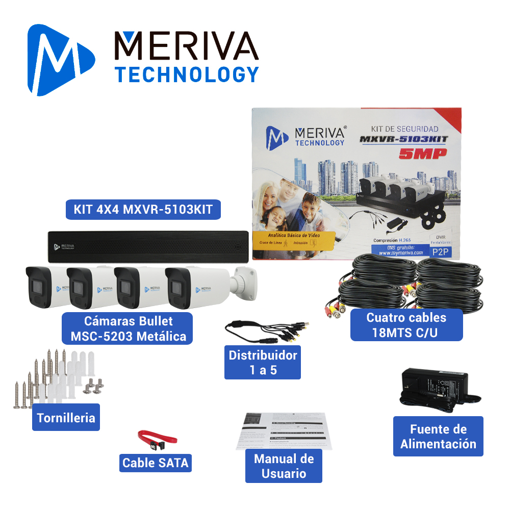 MERIVA TECHNOLOGY - CCTV HD - KITS - MXVR-5103KIT El KIT de Videovigilancia MXVR-5103KIT contiene todo lo necesario para una instalación profesional. El sistema permite grabar a una resolución de alta definición a 5MP-Lite, 4MP-Lite, 1080P y soporta 2 canales IP, audio, CoC y RS485 para PTZ&#x\1;s, conexión a internet por P2P, salida de video HDMI 1080P, analíticas de video (Cruce del línea, Intrusión y anormalidad de video), incluye cables, fuente y cámaras. Contenido del KIT: 1 DVR MXVR-5104 4 Cámaras Bullet MERIVA MSC-5203 Metálicas. 4 Cables pre ponchados siamés de 18m c/u 1 Mouse. 1 Cable SATA. Tornillos para Disco Duro.* 1 Fuentes de Poder 12VCD@4Amp. 12 Pijas y 12 taquetes. Instructivos de cámaras.*No Incluye Disco Duro