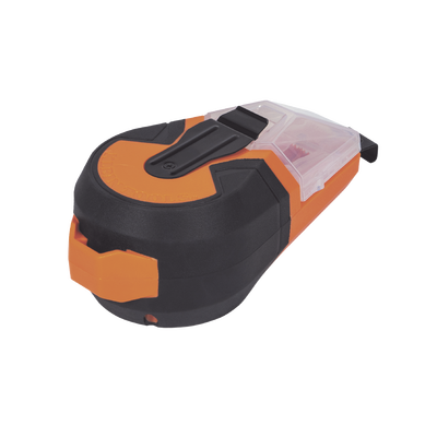- Carrete autorretráctil que rebobina rápidamente 50' (15,24 m) de hilo con presionar un botón