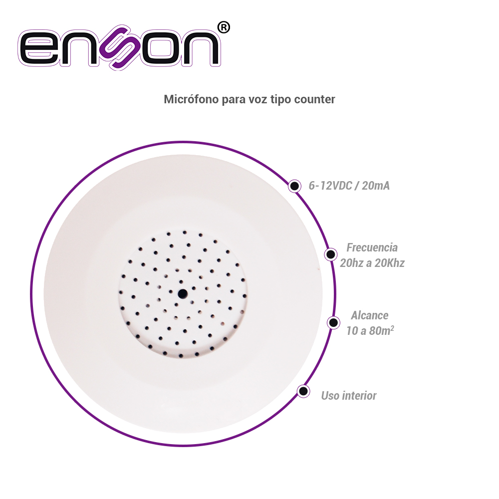 ENSON ENS-PA7MICMicrófono que transmite voz clara recomendado para ser utilizado en sistemas bancarios, aduanas, hoteles de lujo etc. Energía: Fuente de alimentación dc 6-12 v | 10mA Rango de frecuencia: 100-100 KHZ Impedancia de salida: 600 ohmios Modo de conexión: Rojo (alimentación), negro (tierra), blanco (audio) Dimensiones: Ã70 mm x 20 mm Temperatura: -25°C ~ 85°C Humedad: 30 ~ 90°C
