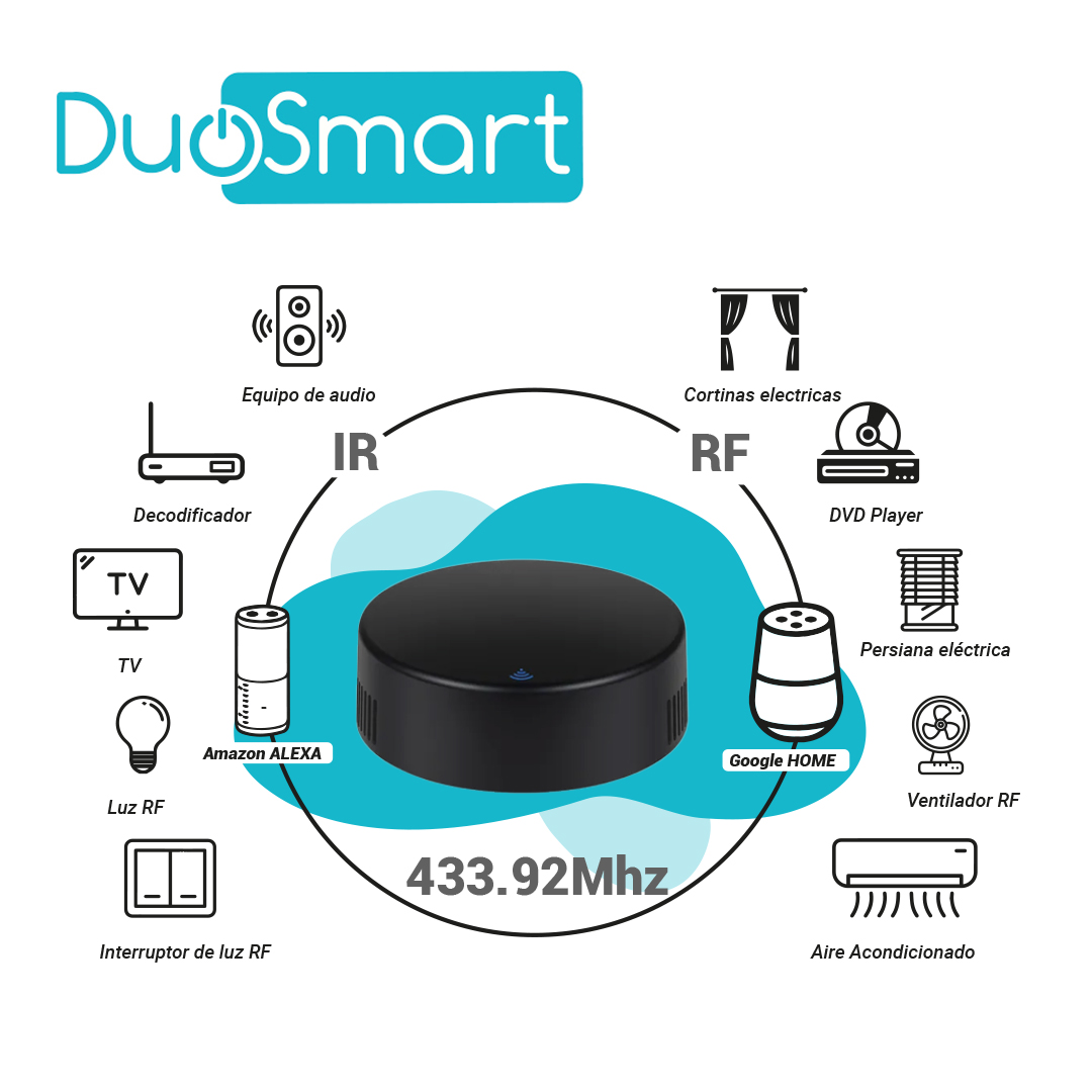 MODULO IR + RF WIFI 2.4GHZ DUOSMART L20 CONTROLA EQUIPOS QUE USEN CONTROL REMOTO INFRARROJO Y RADIO FRECUENCIA COMPATIBLE CON APP DUOSMART
