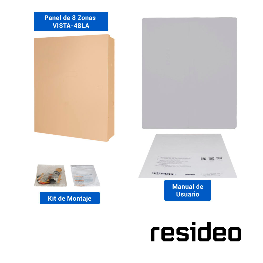 PANEL DE ALARMA 8 ZONAS HONEYWELL VISTA48LA Este panel de control permite la carga y descarga de programación con cualquier comunicador que esté conectado al bus ECP del panel. Soporta hasta 4 teclados táctiles,le permite manejar tres particiones independientes y es totalmente compatible con Resideo Total Connect 2.0 Especificaciones 8 zonas básicas alámbricas, hasta 7 pueden ser dobladas o doble balanceadas 3 particiones independientes, una puede ser seleccionada como área común 48 códigos de usuario, cada uno con niveles asignables de autoridad Carga / Descarga por internet Soporte de teclado gráfico Aumento de dígitos de número para reporte telefónico Restablecimiento automático de alarma Código de sabotaje (CS) lock out Compatible con la serie inalámbrica 5800 (hasta 40 zonas)
