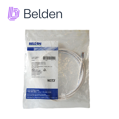 CA21109007 BELDEN Patchcord UTP CATEGORIA 6A, CMR, T568A / B-T568A / B, Blanco, 7 pies (2.1 metros). Conductor calibre 24 AWG Tipo Solido 100% cobre Numero de conductores 8 Máxima tensión de tracción recomendada: 25 lbs. Uso interior Color Blanco Partes relacionadas: jack modulares 10GX, patch panel CAT 10GX Plug / Jack Compatibilidad: RJ45