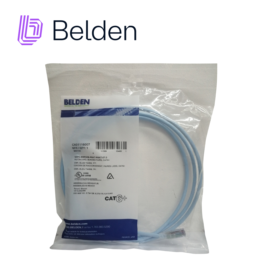 C601116007 BELDEN Patchcord UTP CATEGORIA 6 , CMR, T568A / B-T568A / B, Azul claro, 7 pies (2.1 m). Conductor calibre 24 AWG Tipo Solido 100% cobre Numero de conductores 8 Rango de temperatura de funcionamiento:-10 A 60 grados centigrados Máxima tensión de tracción recomendada: 25 lbs. Uso interior Color Azul claro Partes relacionadas: jack modulares CAT6 , patch panel CAT 6 Plug / Jack Compatibilidad: RJ45 longitud 7 pies 2.1 metros