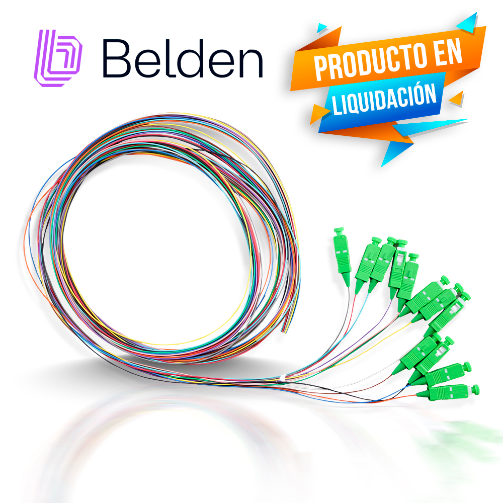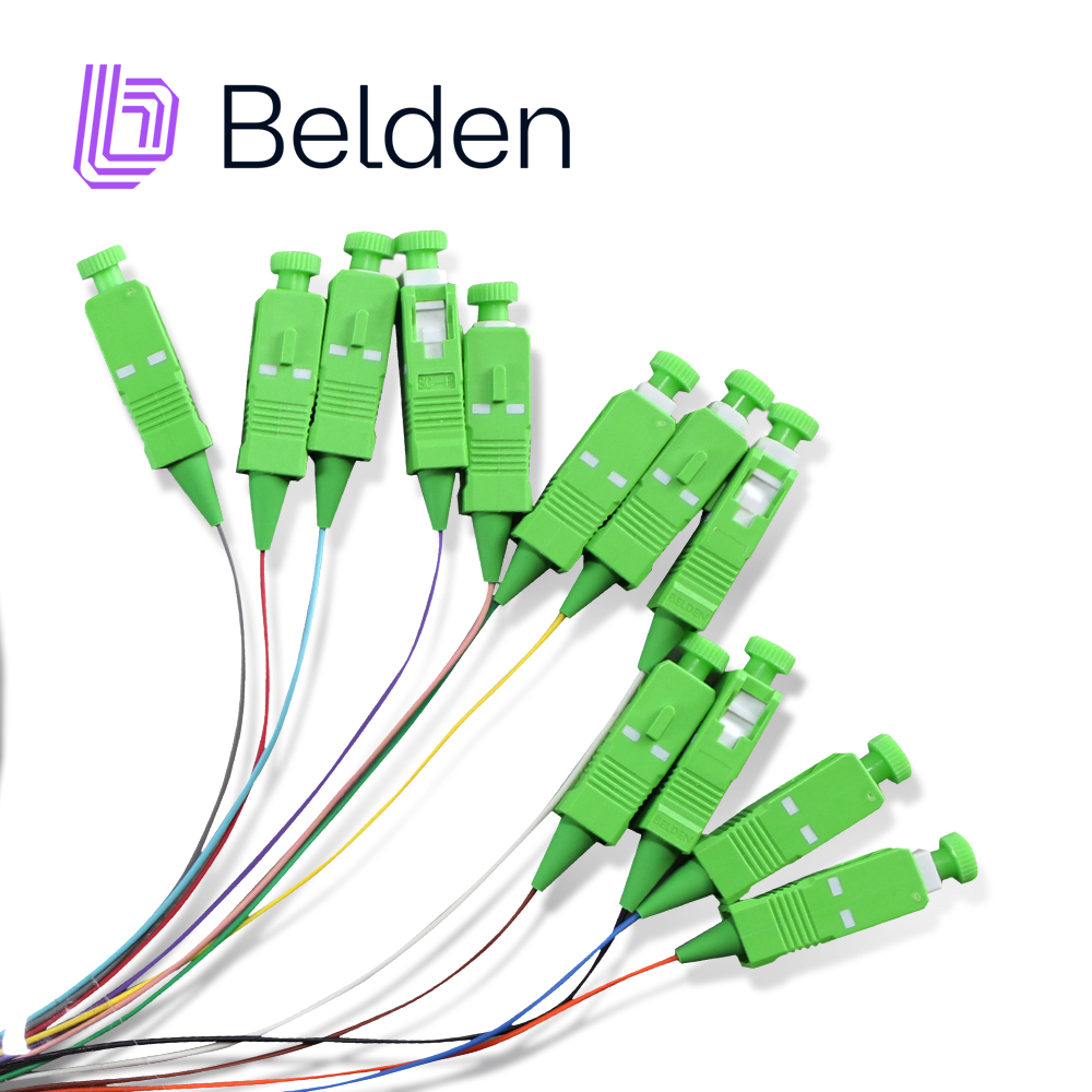 FTSSB900PR12 BELDENPigtail de terminacion en campo monomodo OS2 Conector SC Simplex APC Bufer 900 micras Codificado en color 12 fibras Aplicaciones adecuadas: centros de datos, salas de equipos principales y salas de telecomunicaciones Partes relacionadas: casetes de empalme FX UHD, marcos Ultra FX, módulos FX Manager y tiras de adaptadores FX Tipo de fibra monomodo Esquema de cableado: TIA / EIA 568-C.3 Embalaje: embalado individualmente. uso interior Notas: código de color de fibra; Azul, naranja, verde, cafe, gris, blanco, rojo, negro, amarillo, violeta, rosa, aguamarina