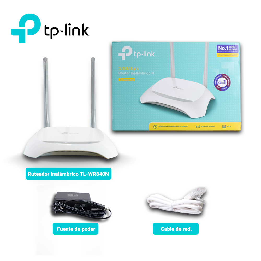 TL-WR840NV2 TP-LINKEl router 300Mbps Wireless N Router TL-WR840N es un dispositivo combinado con cable / inalámbrico de conexión de red diseñado específicamente para las necesidades de pequeñas empresas y oficinas domésticas de redes. El TL-WR840N crea un rendimiento inalámbrico excepcional y avanzado, lo que lo hace ideal para el streaming de video de alta definición, VoIP y juegos en línea. Además, Wi-Fi Protected Setup (WPS) en el exterior elegante y de modo, asegura al WPA2 la prevención de la red de intrusiones externas. NOTA: El modo WISP solo es compatible con la versión 6.20 o superior de TL-WR840N. Velocidad de transmisión Inalámbrica de 300Mbps 4 puertos ethernet 10/100Mbps LAN PORTS 1 puerto ethernet 10/100Mbps WAN PORT Fuente de alimentación 9VDC / 0.6A Fácil encriptación de seguridad con sólo presionar el botón WPS El Control de Banda ancha basada en IP permite que los administradores determinen cuánta banda ancha está distribuida a cada PC El puente inalámbrico WDS proporciona un conexión de enlace sin interrupción para expandir su red inalámbrica.