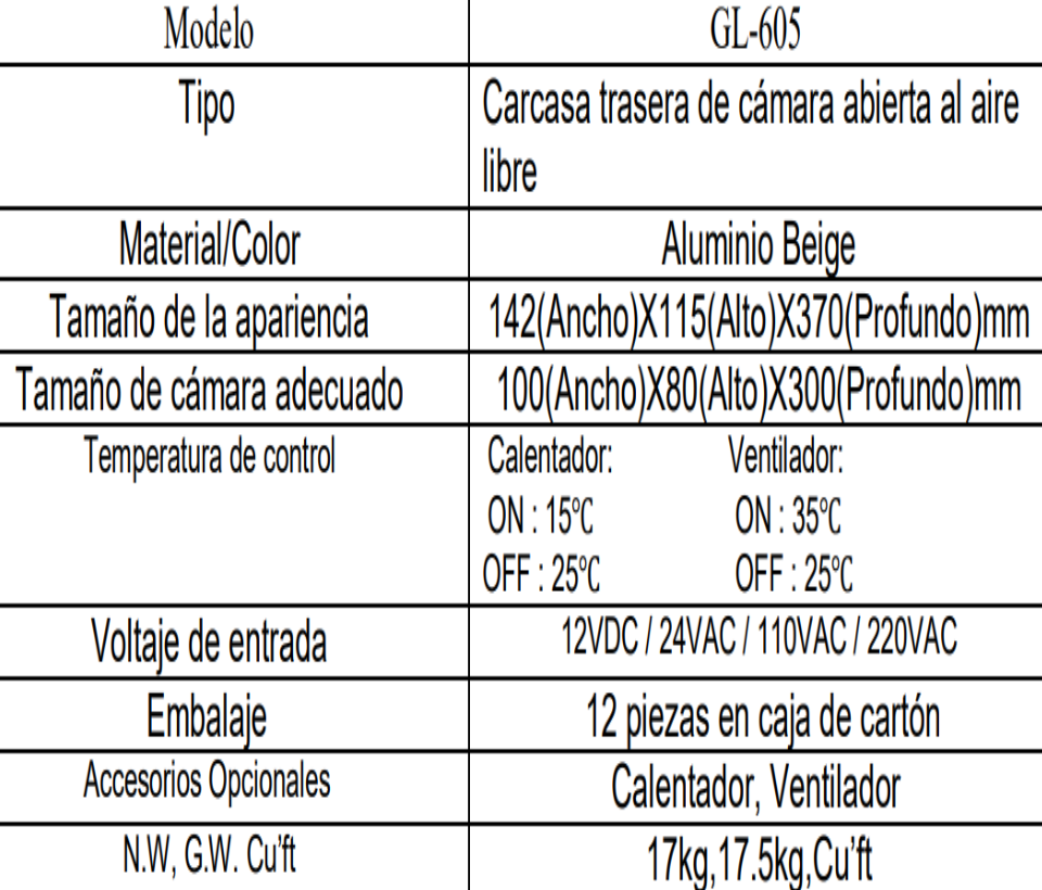 - Medidas de cámara recomendada: 10.0(W)X8.0(H)X30.0(L)cm